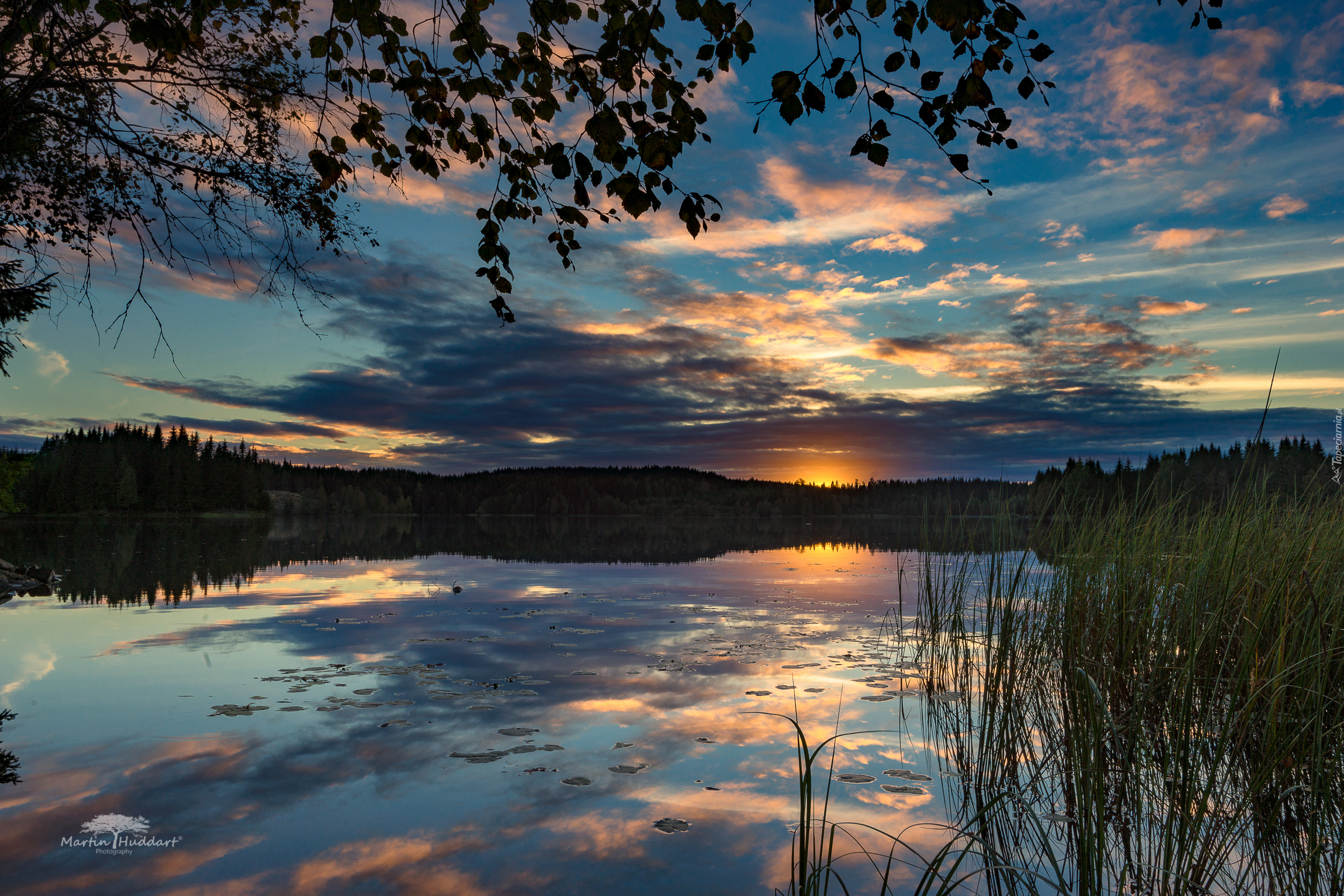 Edytor tapety: Jezioro z brzegiem porośniętym trzciną o zachodzie słońca