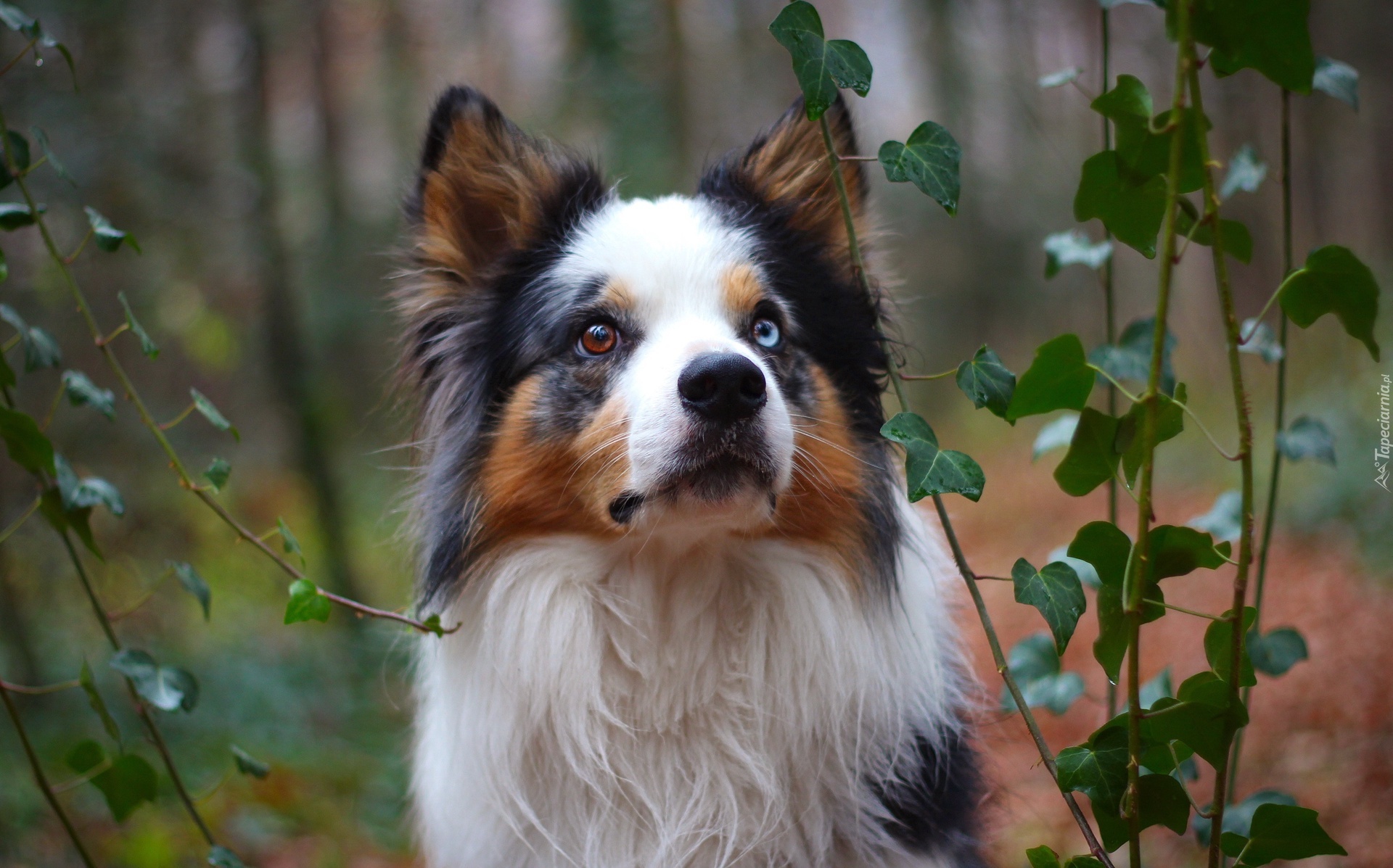 Edytor tapety: Pies border collie pomiędzy pnączami bluszczu