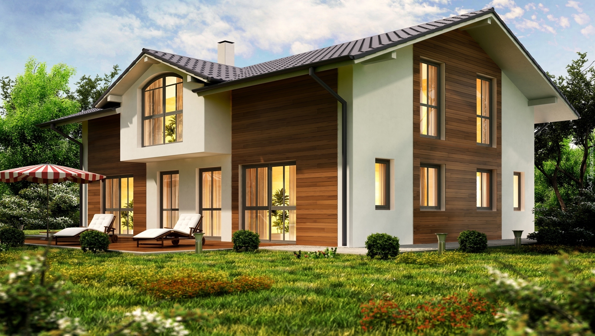 Edytor tapety: Dom z tarasem otoczony drzewami i roślinnością