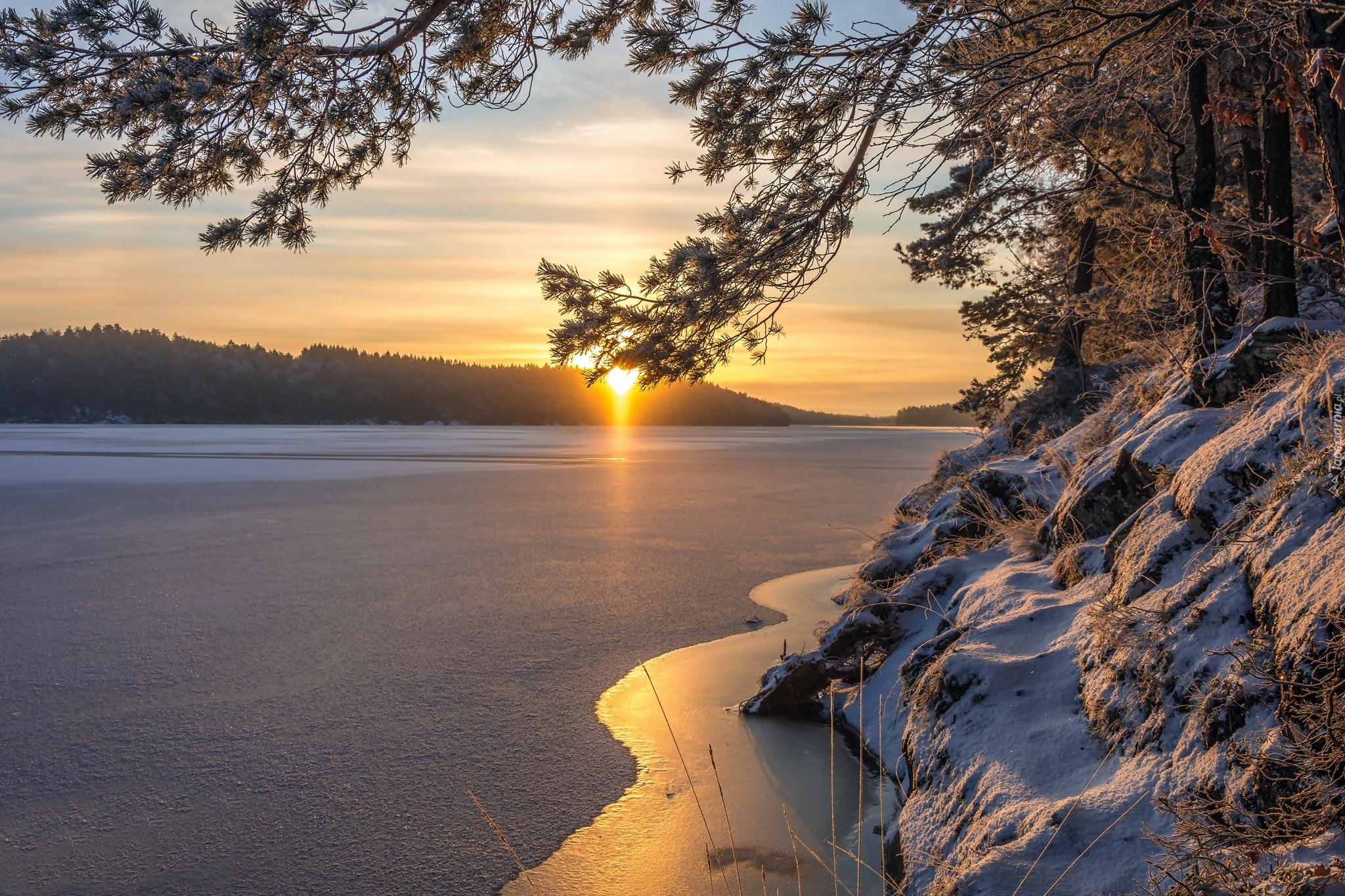 Edytor tapety: Zimowy las nad jeziorem o zachodzie słońca