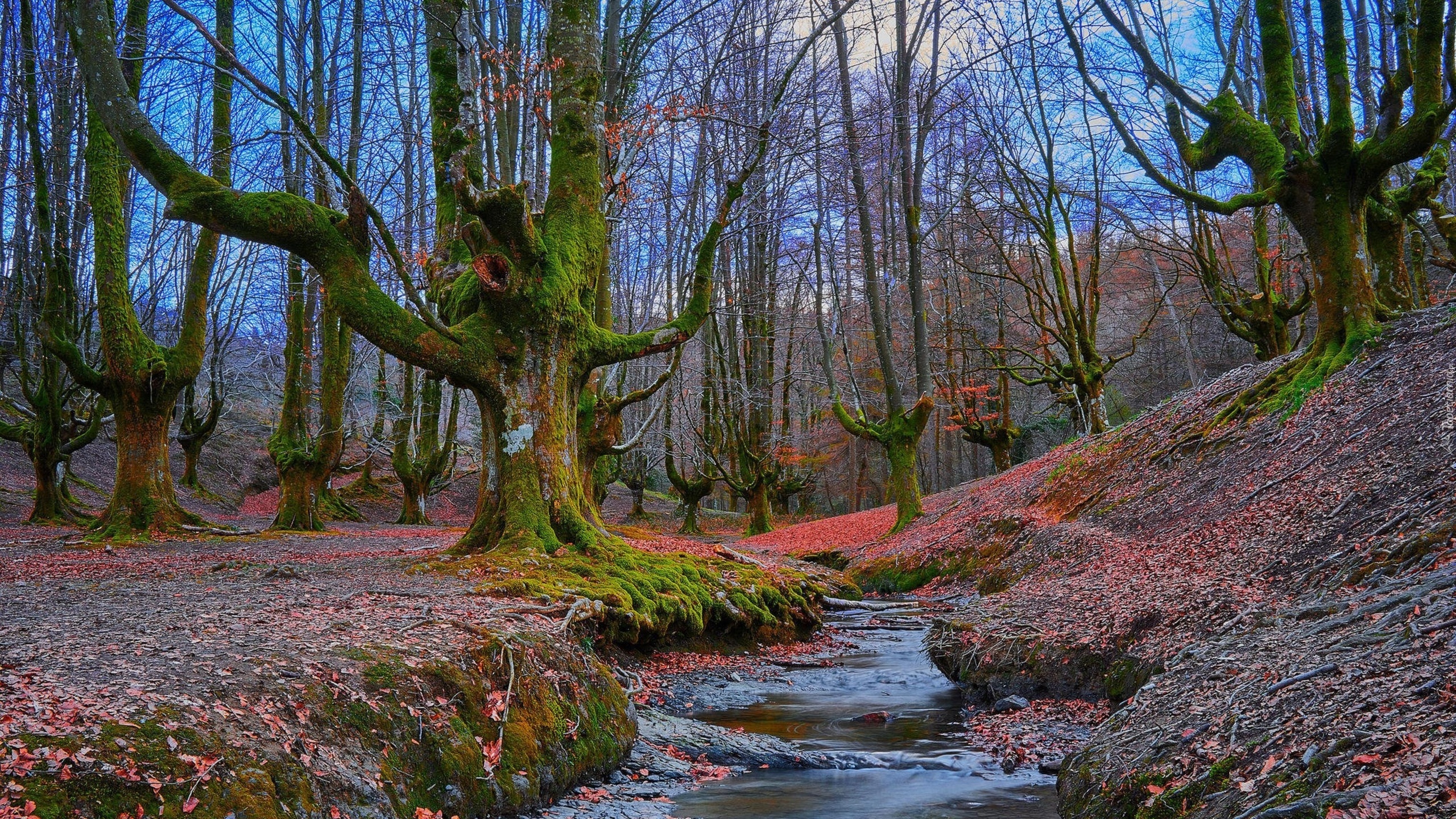 Edytor tapety: Strumyk przepływający w jesiennym lesie pomiędzy omszałymi drzewami