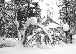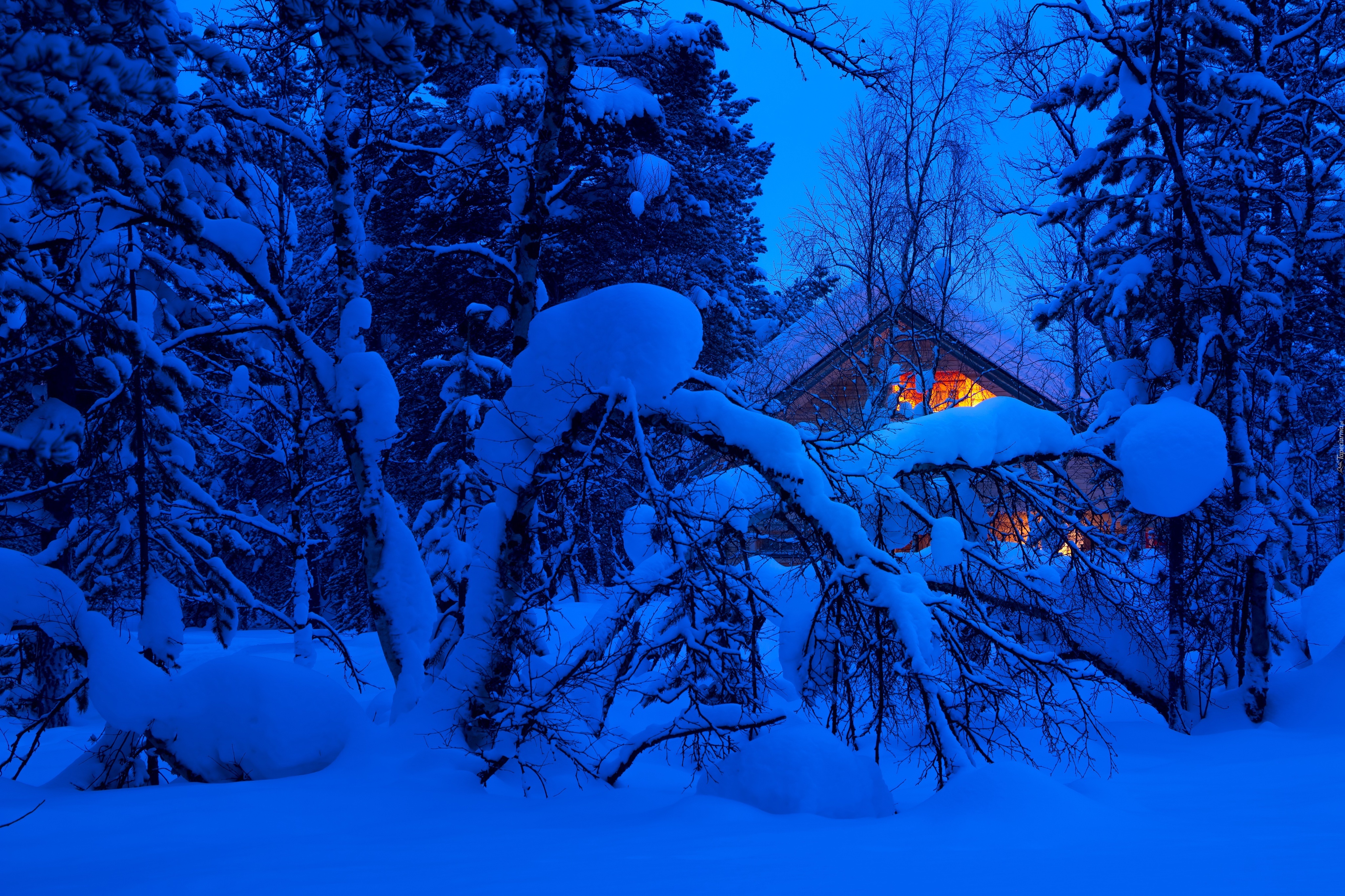 Edytor tapety: Oświetlony dom pośród ośnieżonych drzew o zmroku