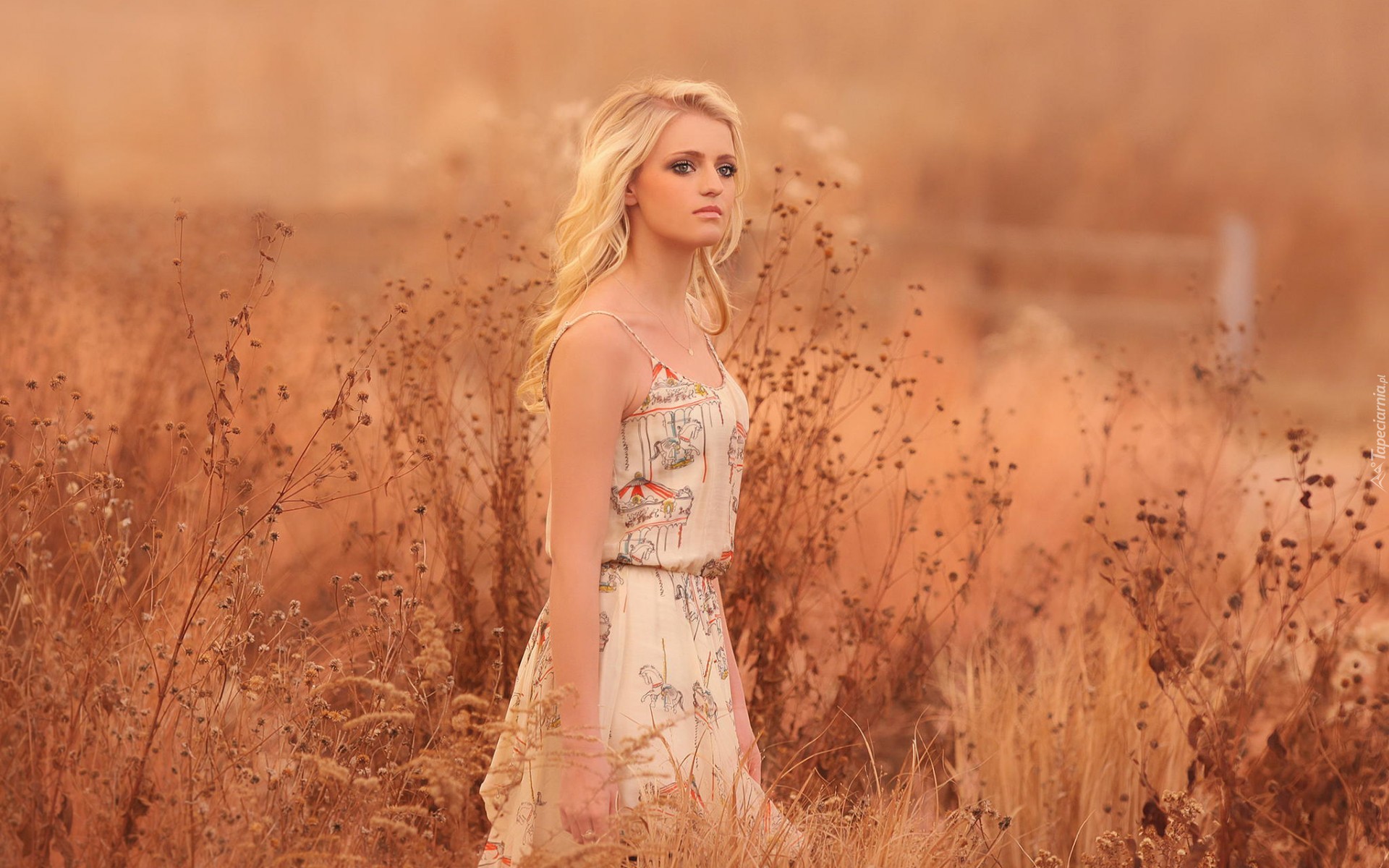 Edytor tapety: Blondynka na łące pośród suchych traw