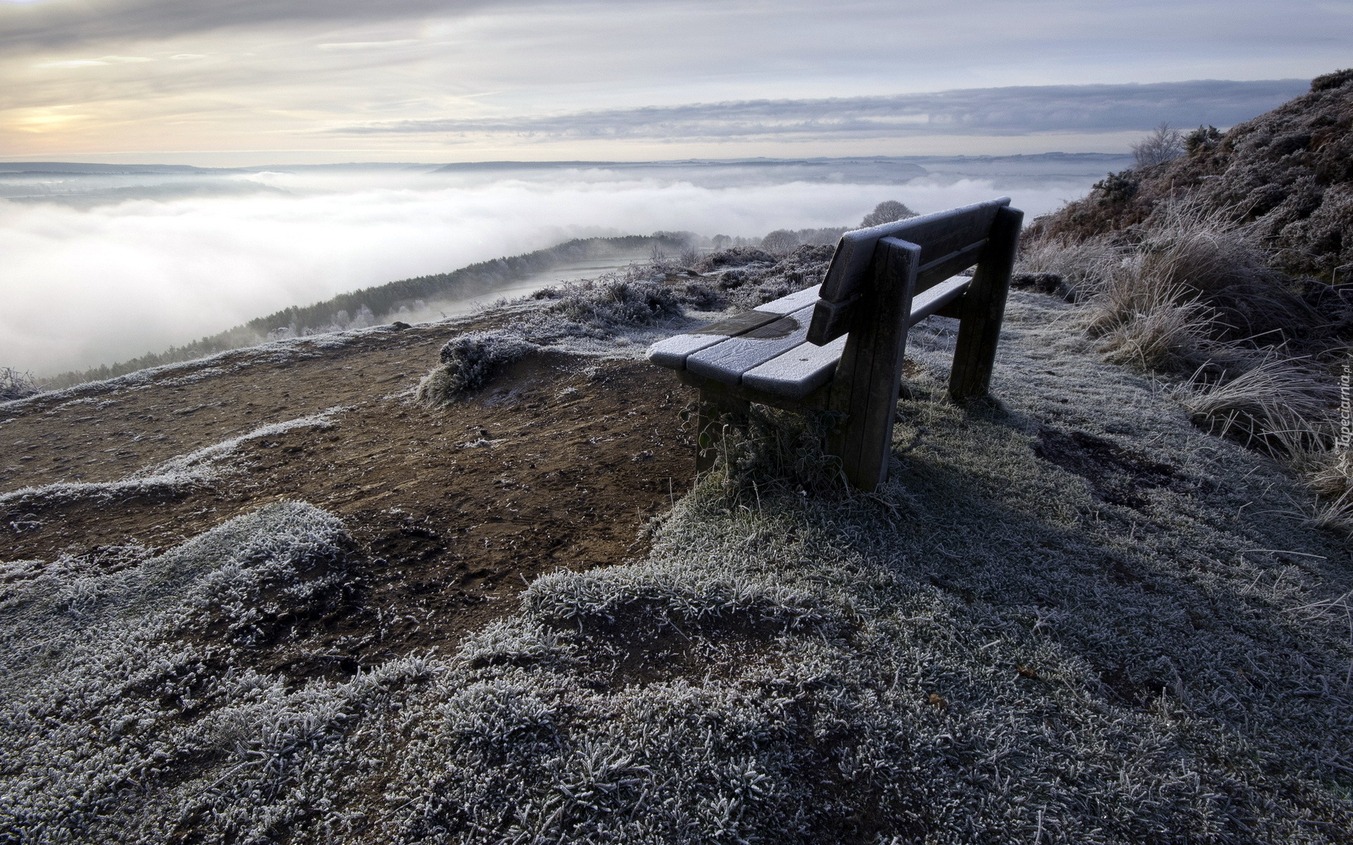 Edytor tapety: Ławka przy jeziorze spowitym mgłą