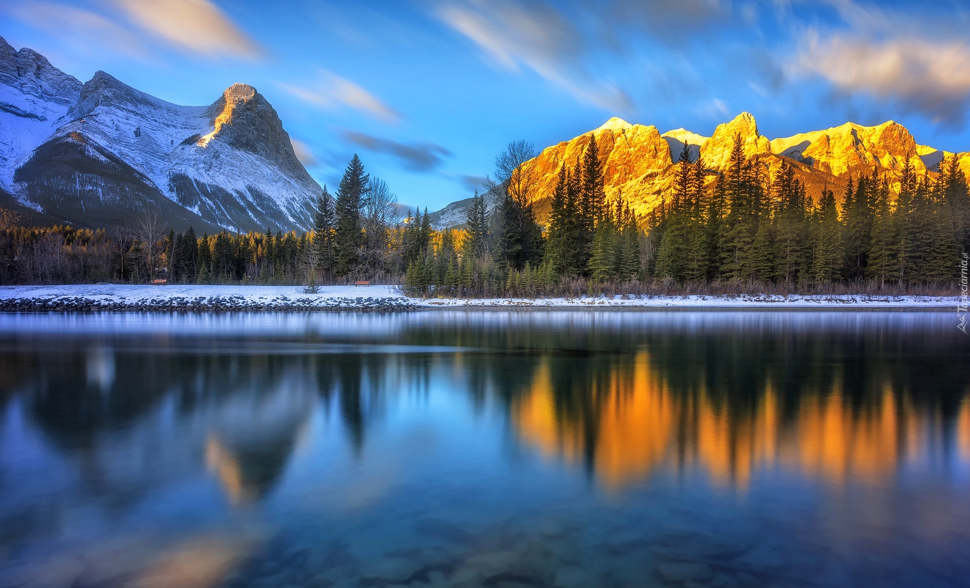 Edytor tapety: Góry i drzewa odbijają się w jeziorze