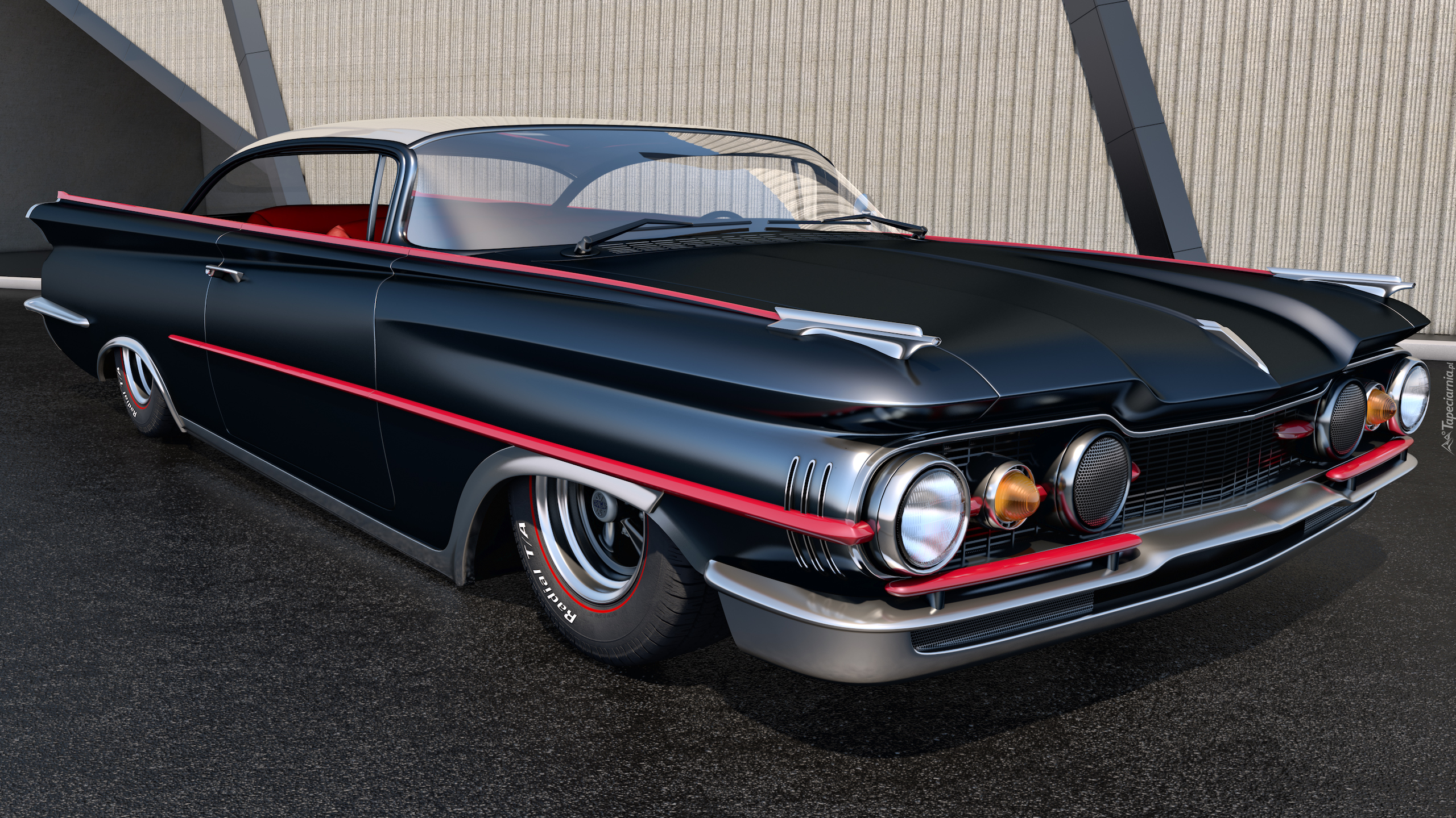 Edytor tapety: Czarny Oldsmobile Super 88 Coupe z 1959 roku