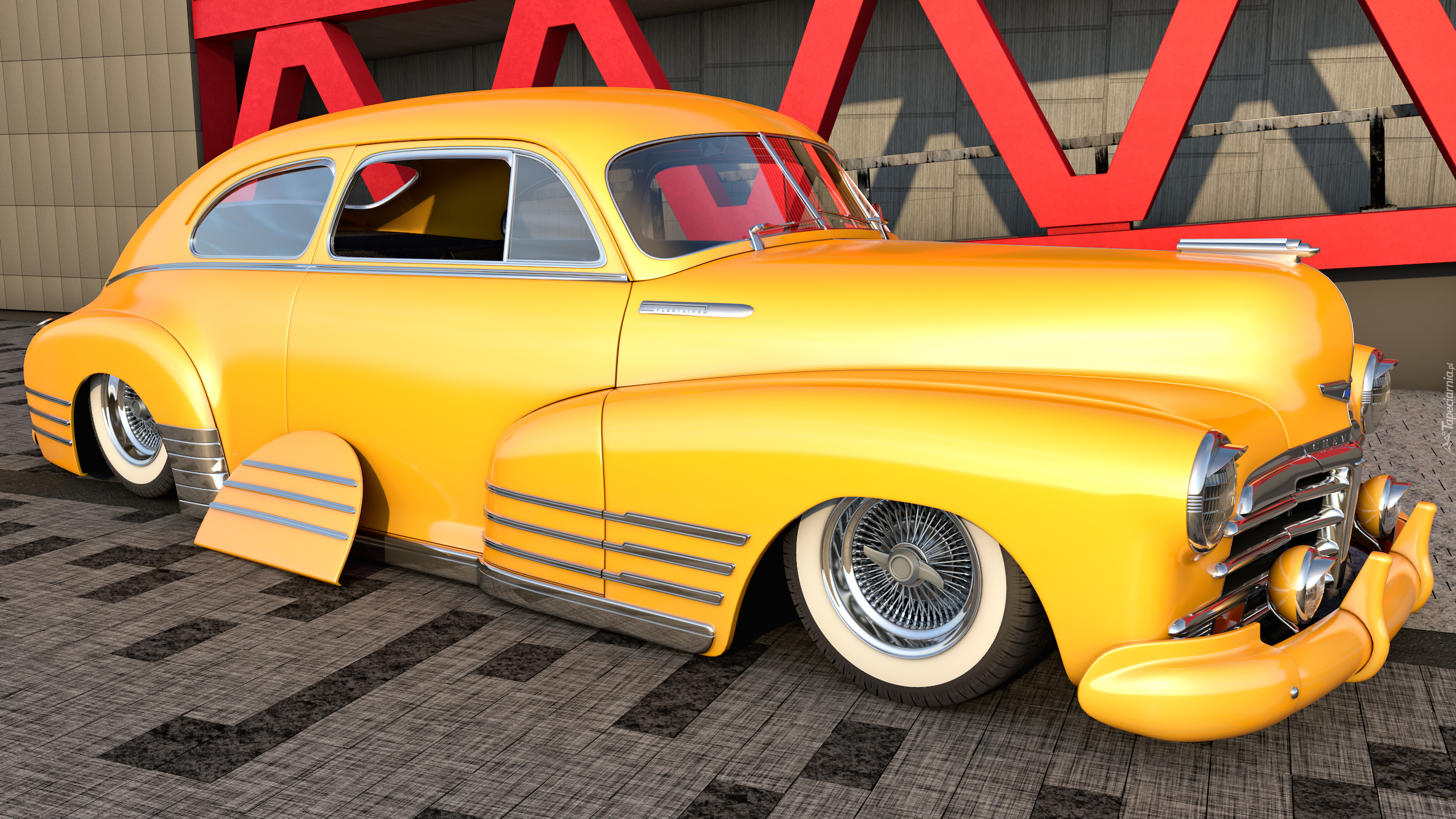 Edytor tapety: Żółty zabytkowy samochód marki Chevrolet Fleetline rocznik 1948