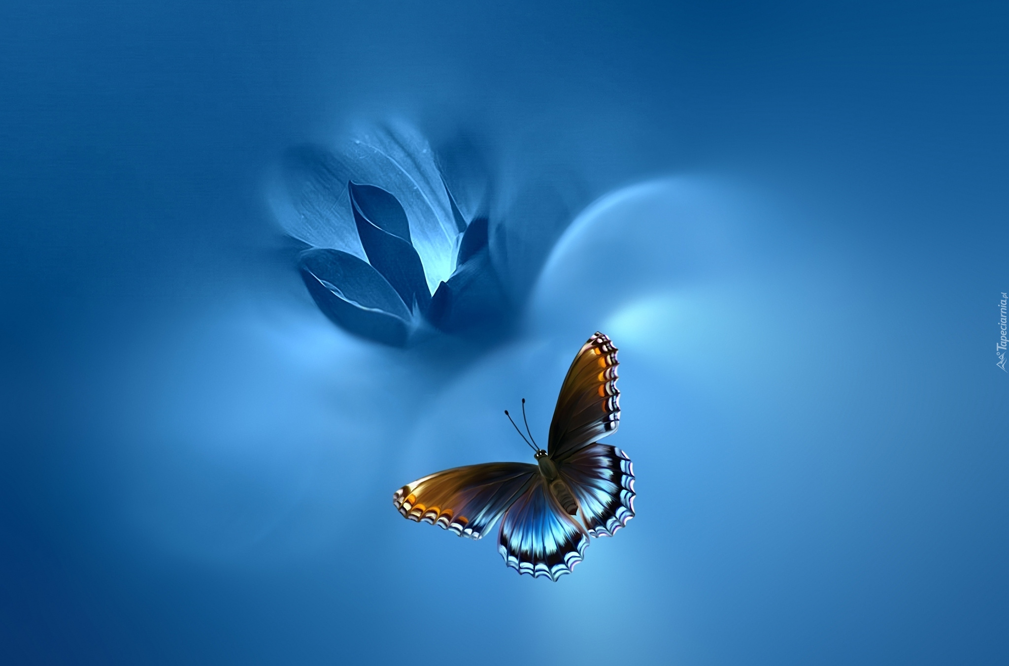 Edytor tapety: Motyl i niebieski kwiat w grafice