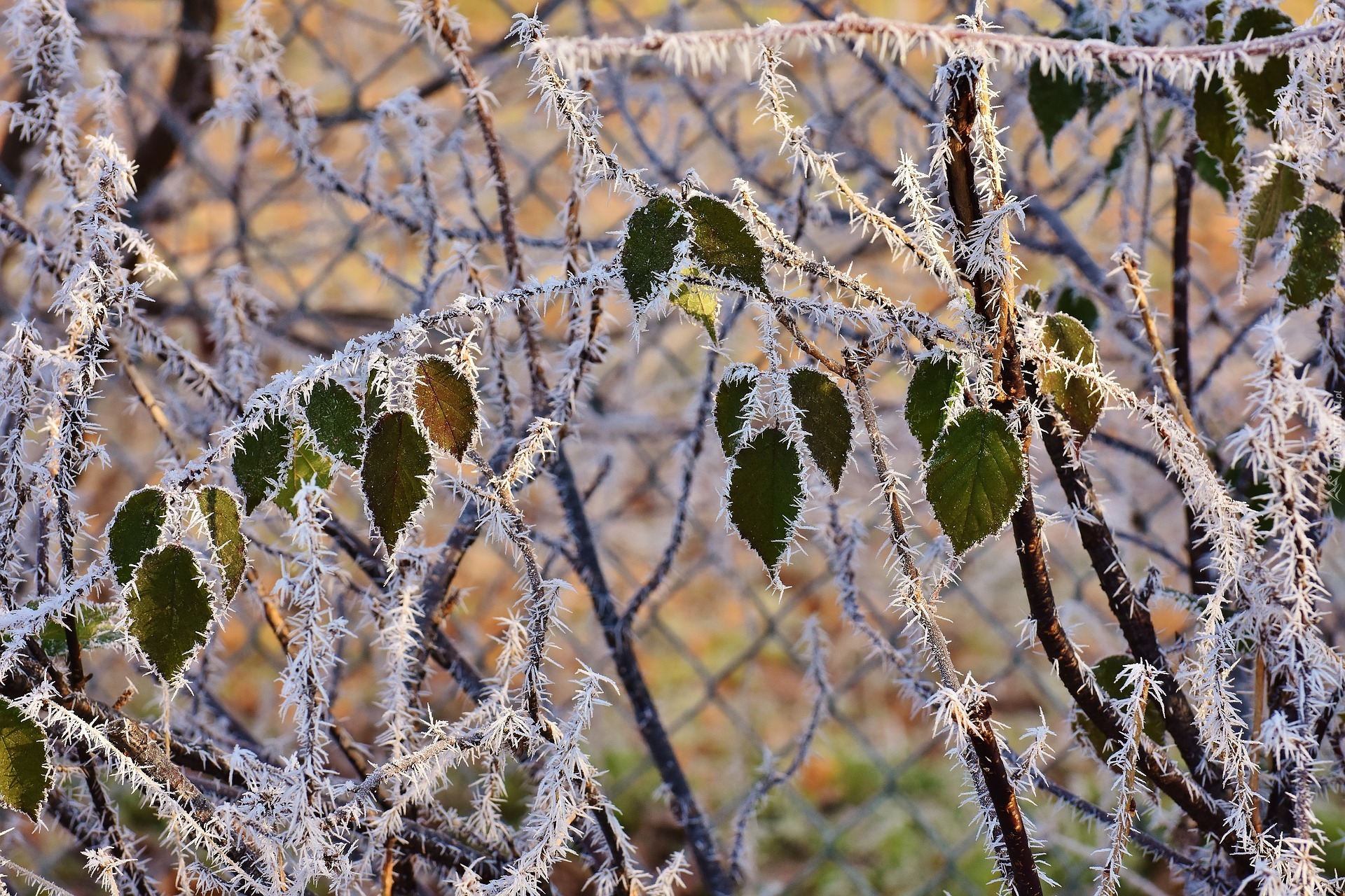 Edytor tapety: Oszronione gałązki z listkami przy ogrodzeniu