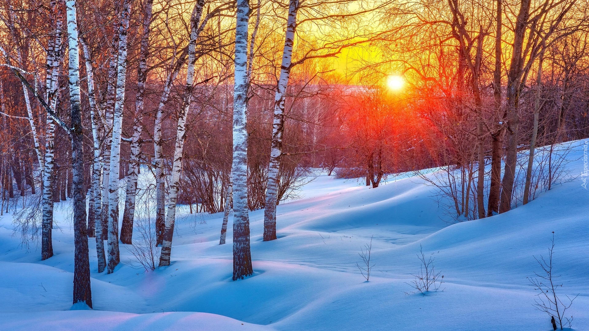 Edytor tapety: Brzozowy las zasypany śniegiem w blasku zachodzącego słońca
