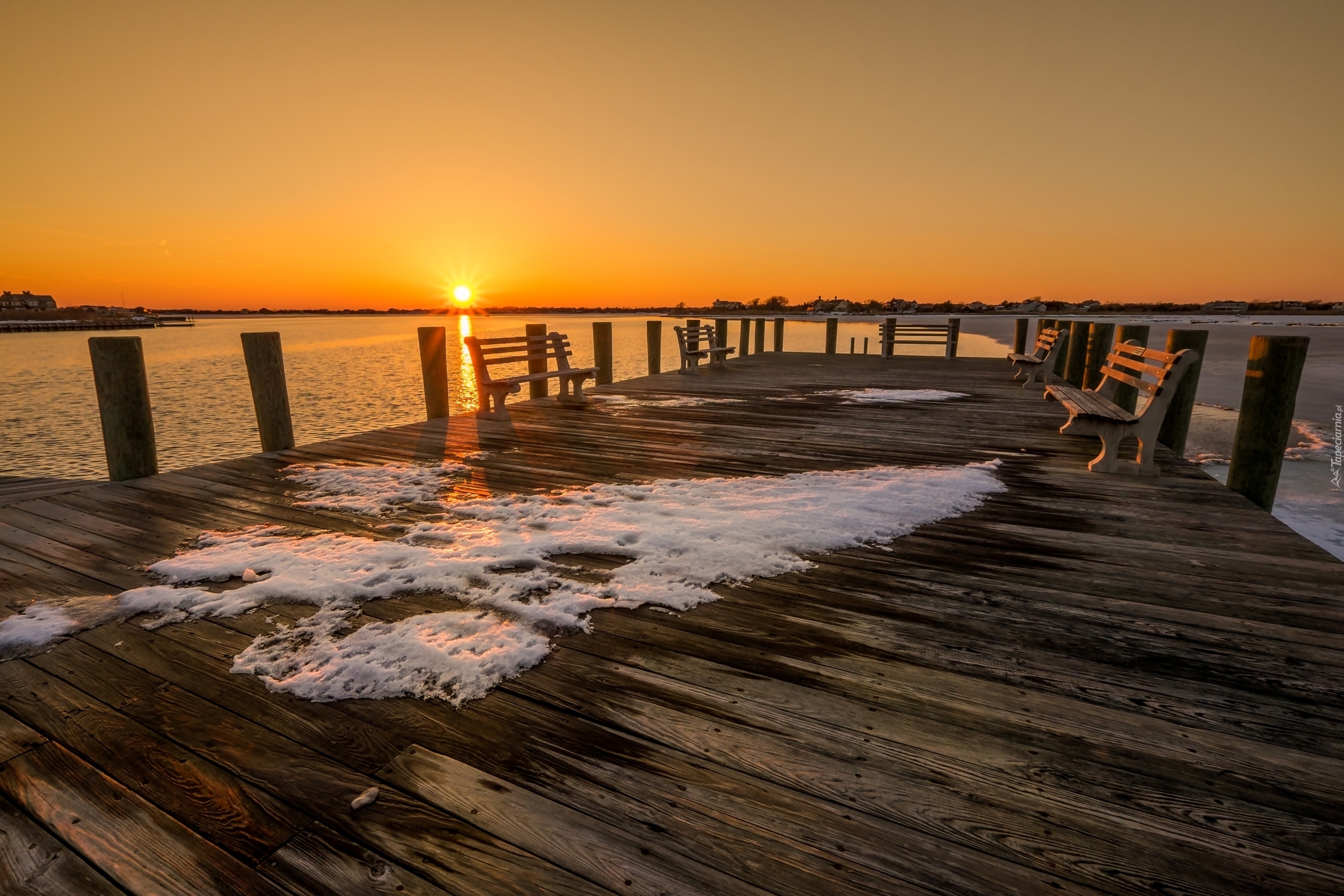 Edytor tapety: Ławeczki na molo w promieniach zimowego słońca