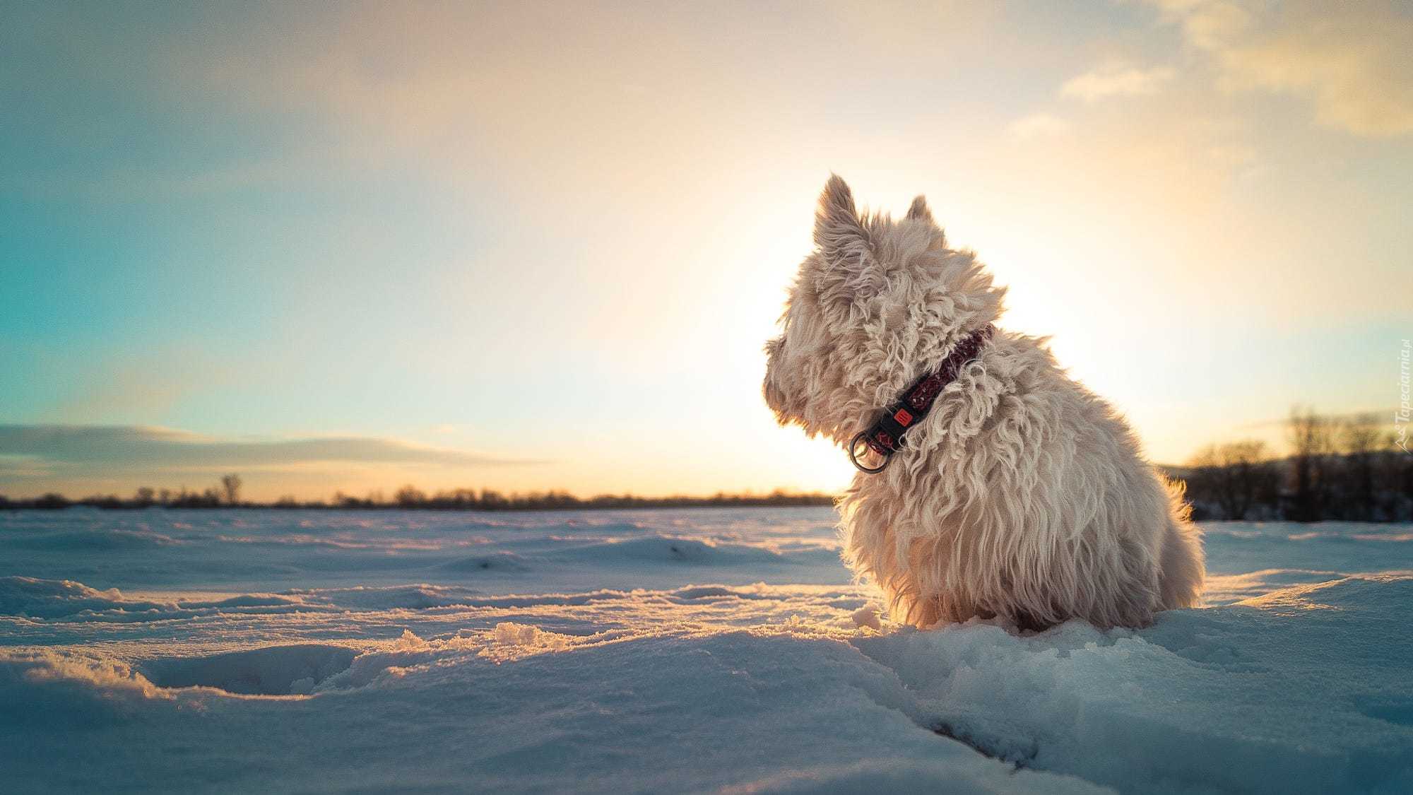 Edytor tapety: Biały pies siedzący na śniegu ogląda zachód słońca