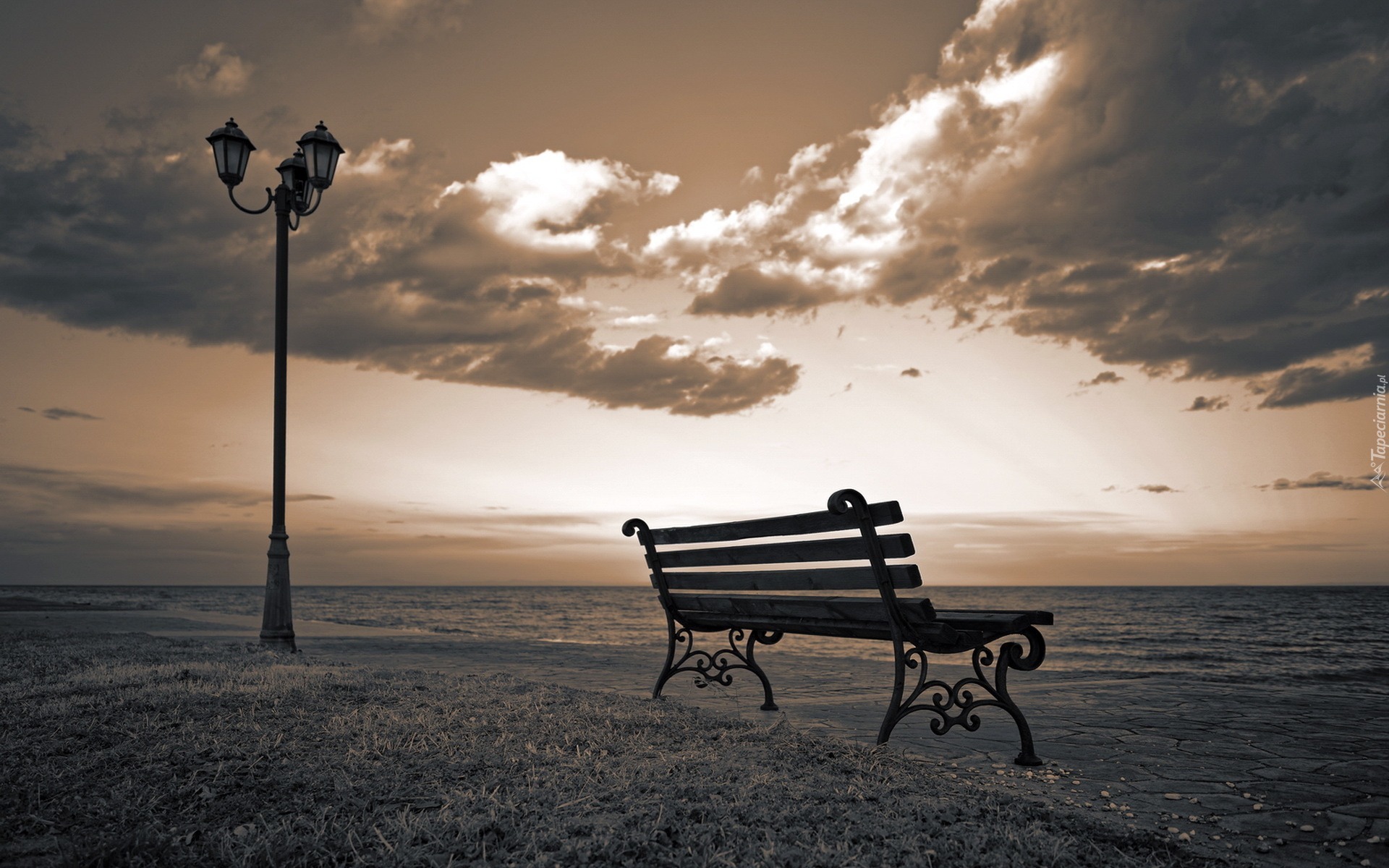 Edytor tapety: Ławka nad brzegiem morza obok latarni