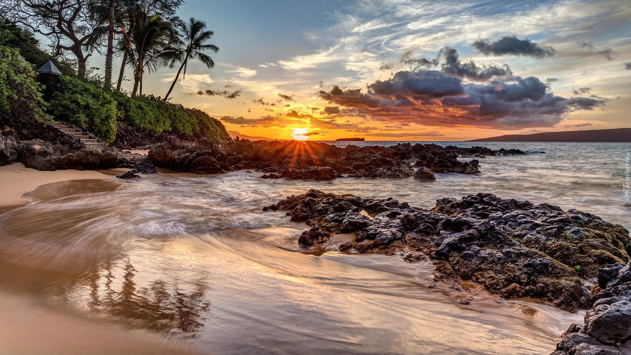 Edytor tapety: Zachód słońca nad skalistym zadrzewionym wybrzeżem