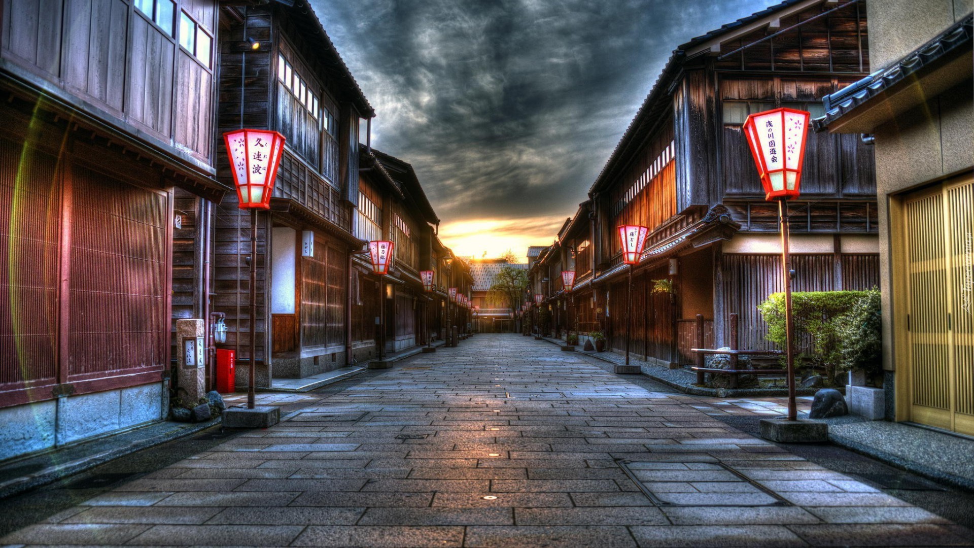 Edytor tapety: Uliczka między domami w Japonii o zmroku
