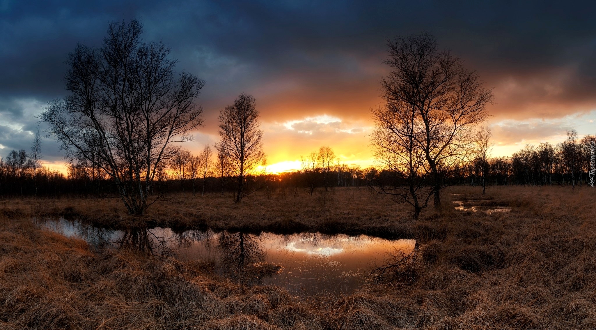 Edytor tapety: Bagno porośnięte roślinnością i drzewami o zachodzie słońca