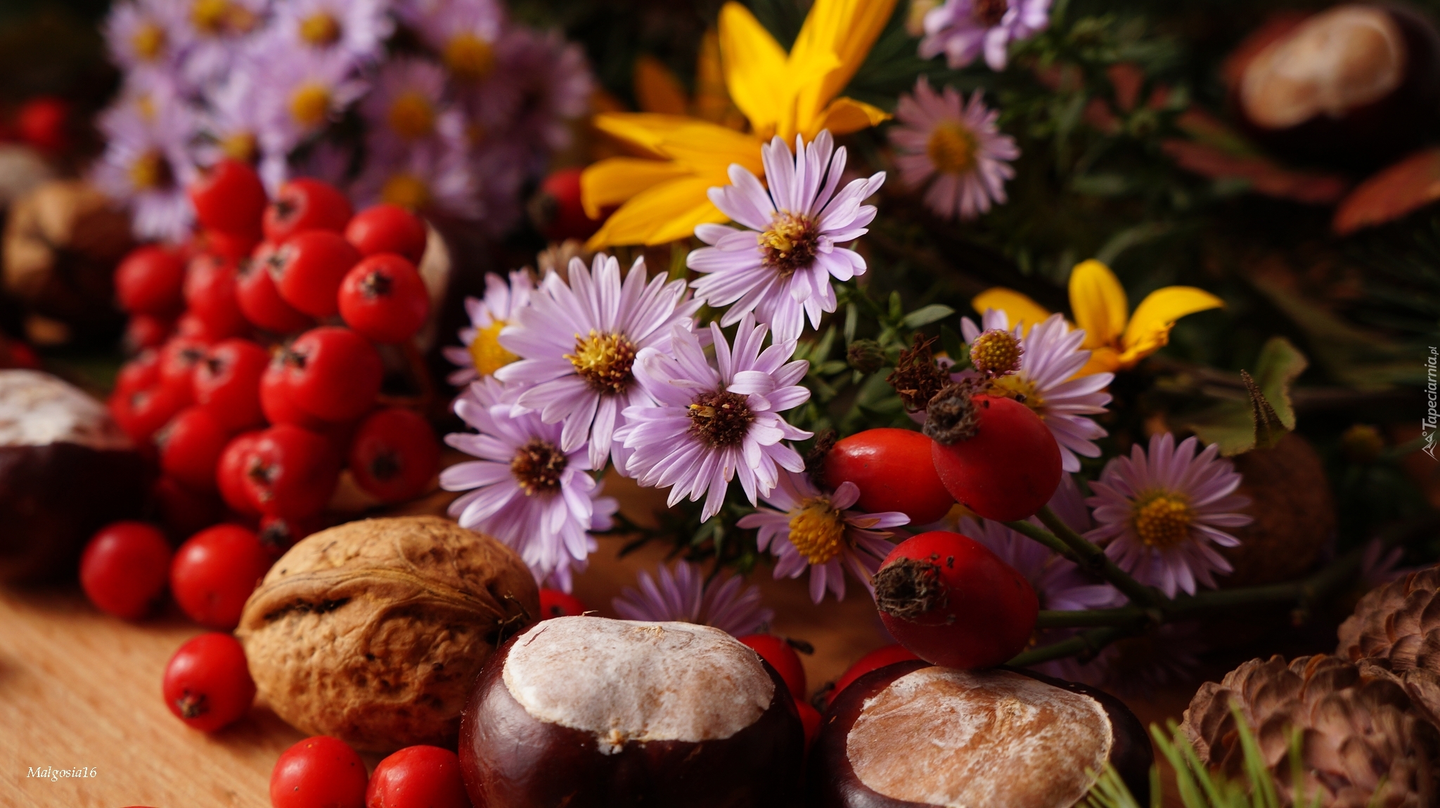 Edytor tapety: Jesienna kompozycja z astrów, kasztanów i jarzębiny