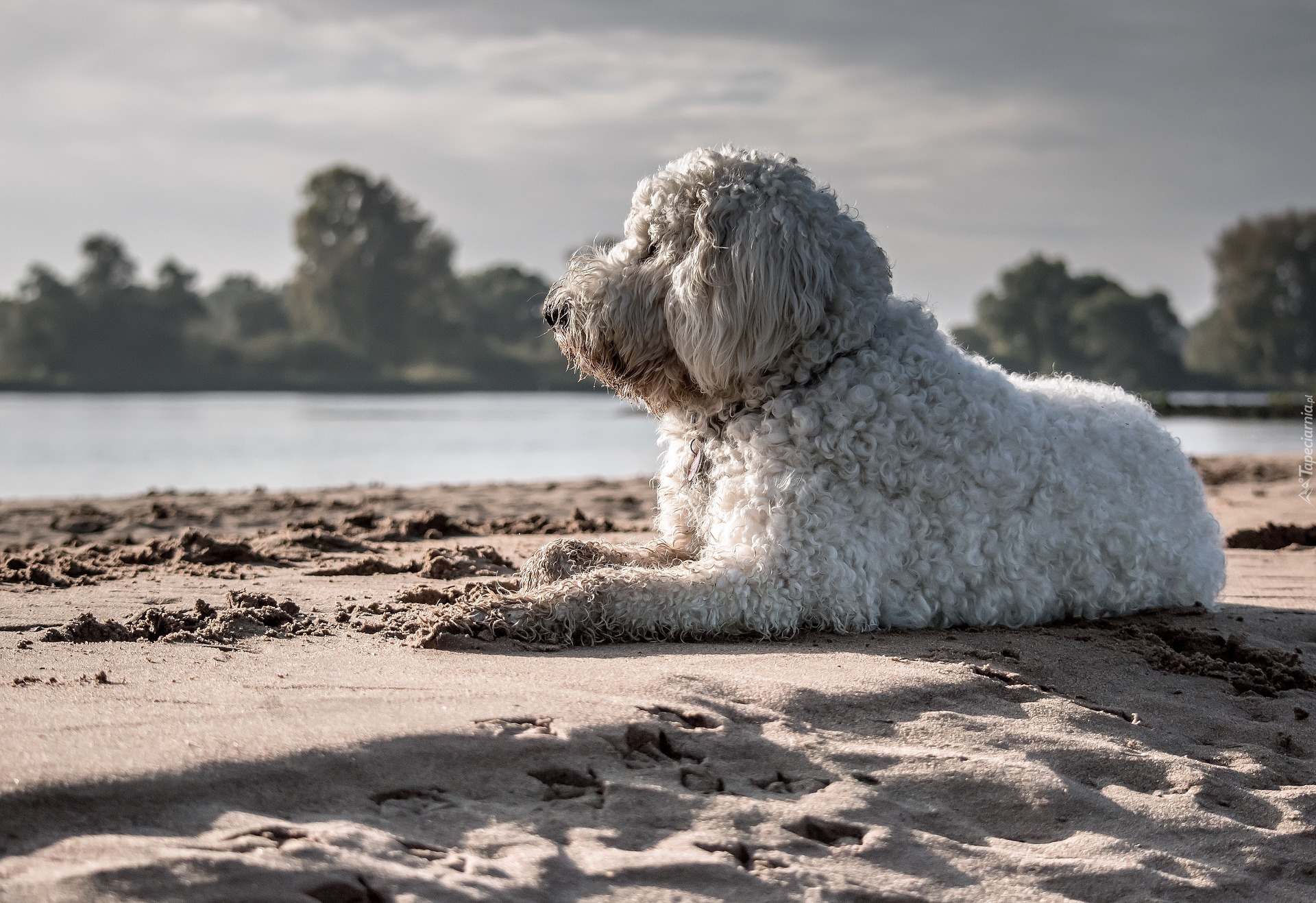 Edytor tapety: Goldendoodle leży na piasku w słońcu