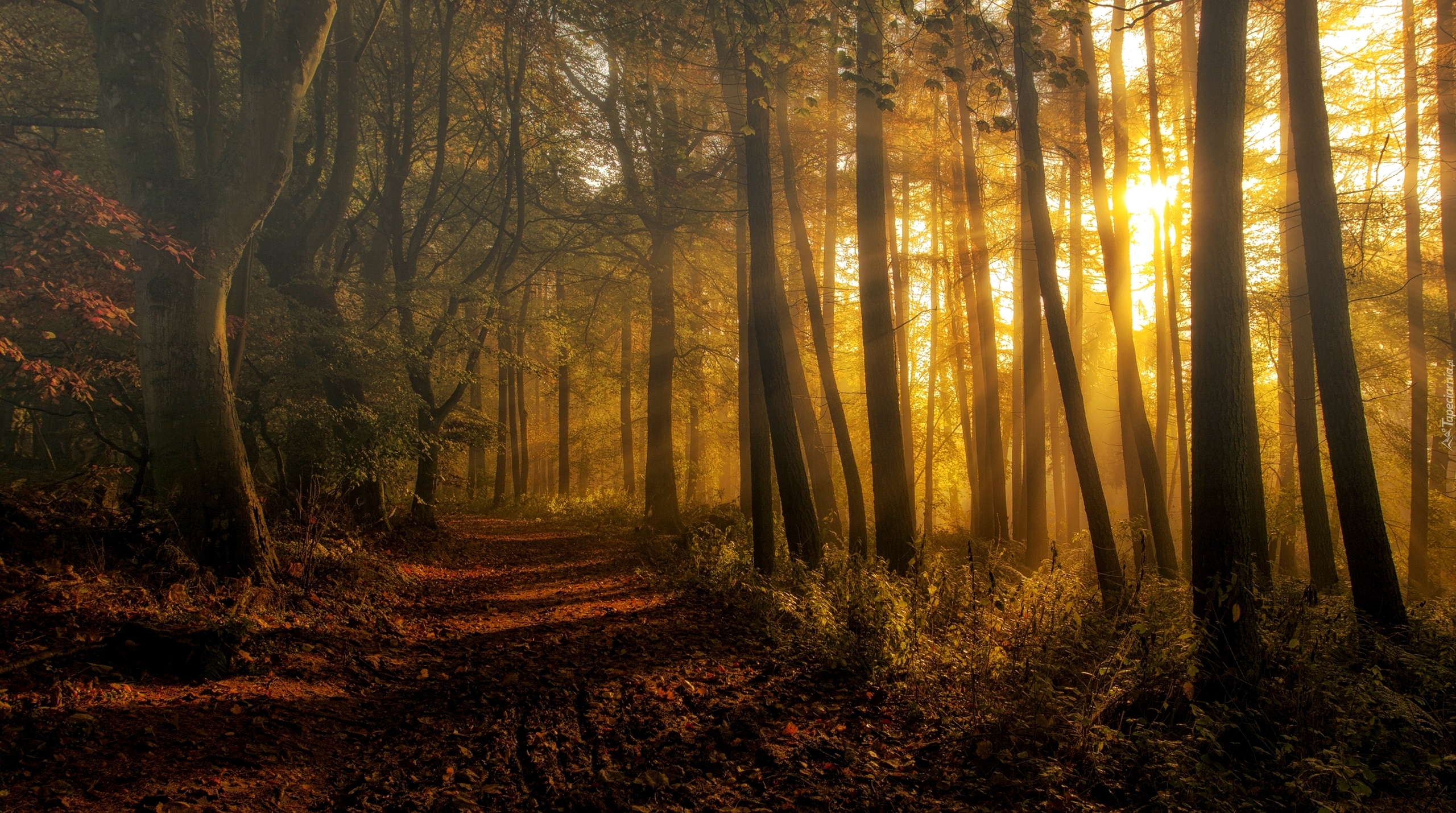 Edytor tapety: Droga w lesie oświetlona słońcem przebijającym między drzewami
