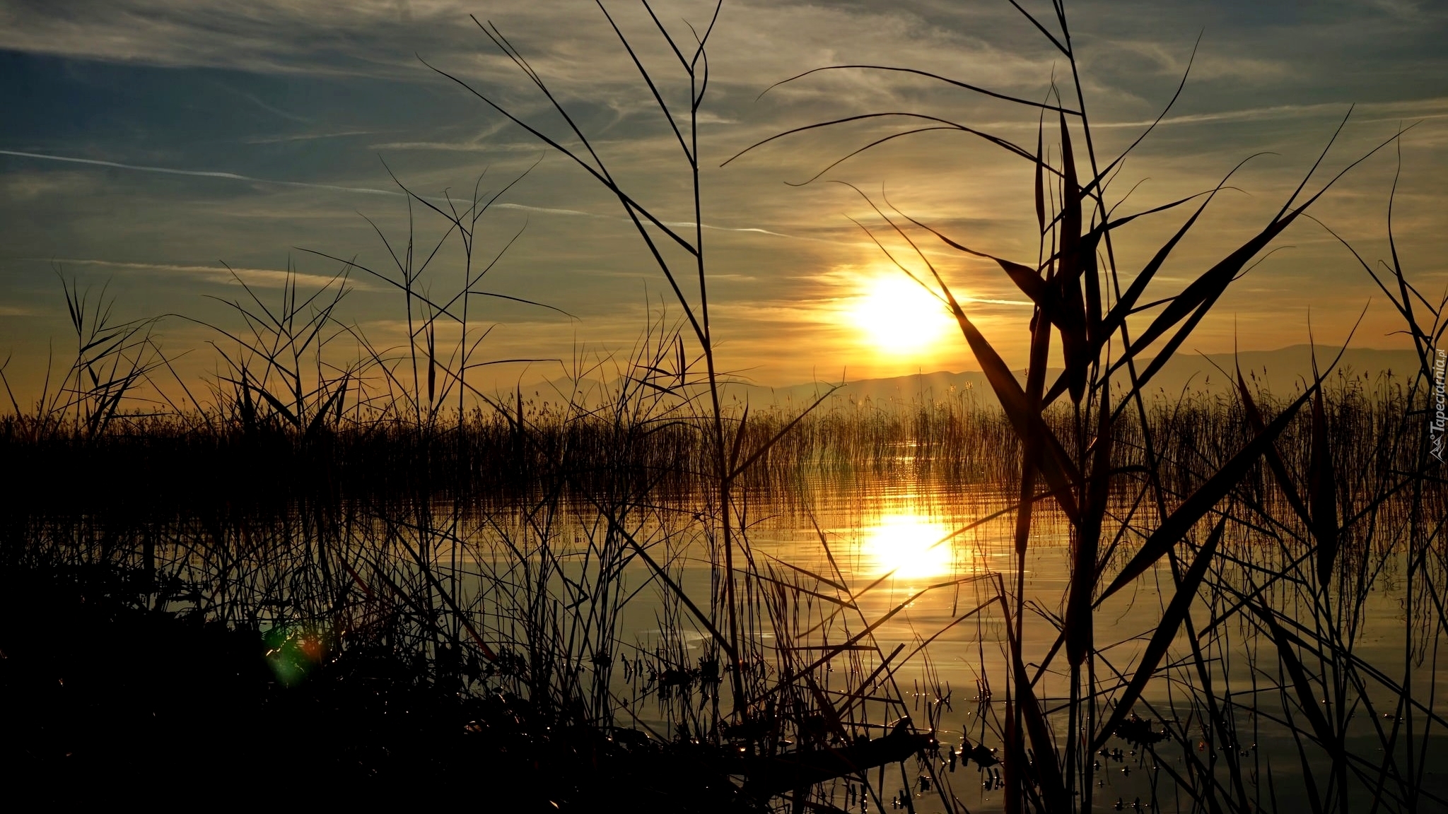 Edytor tapety: Jezioro porośnięte trzciną w blasku zachodzącego słońca