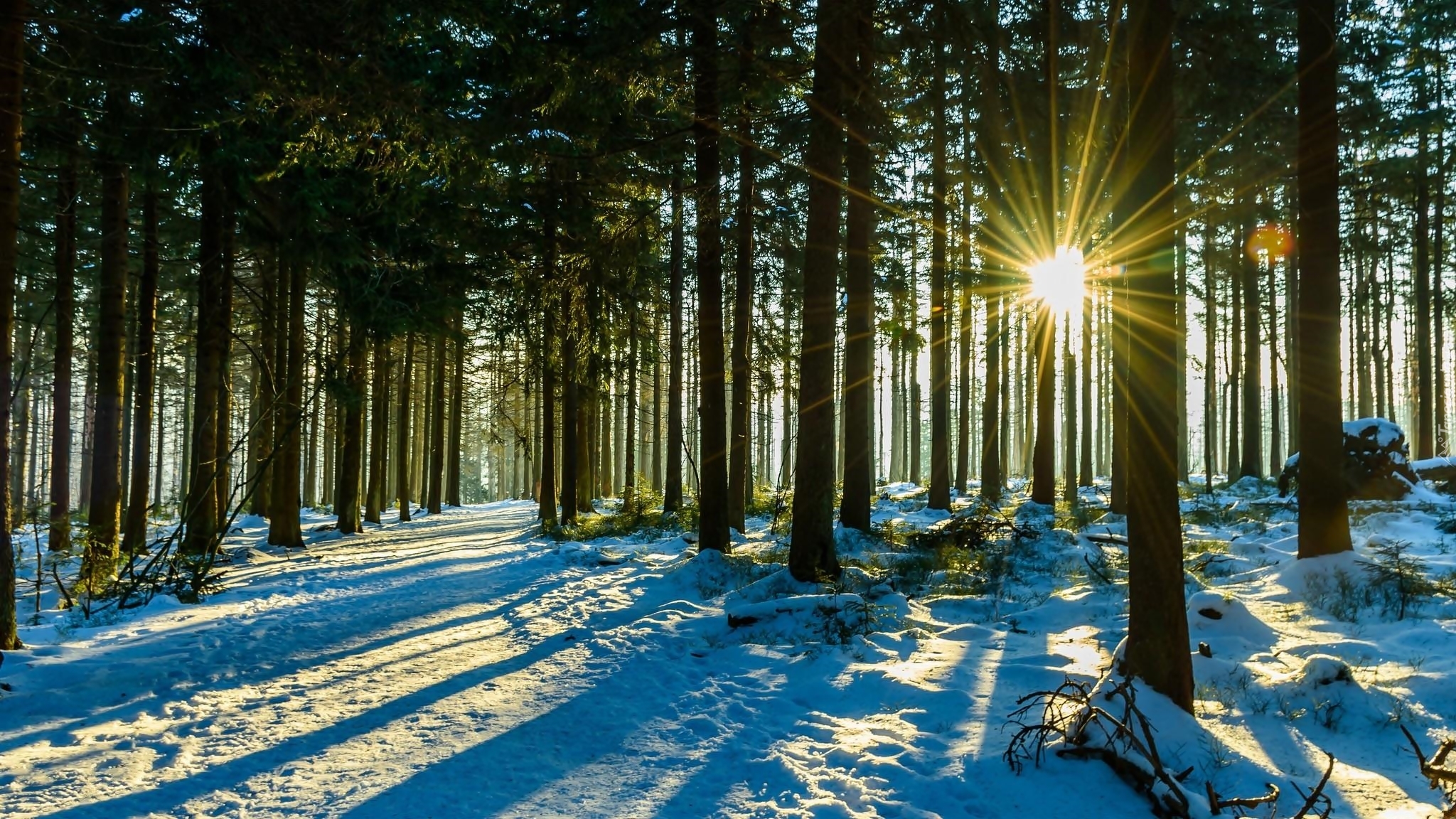 Edytor tapety: Promienie słońca zaglądają do zimowego lasu
