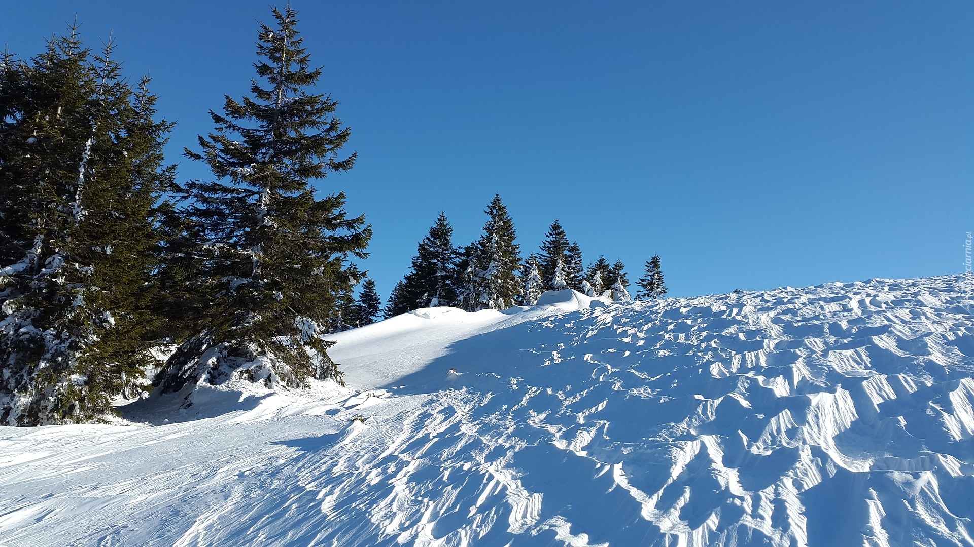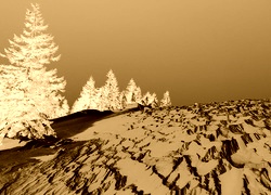 Edytor tapety: Drzewa na wzgórzu pokrytym śniegiem