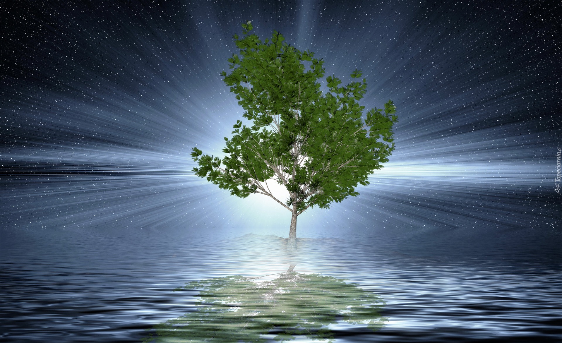 Edytor tapety: Zielone drzewo w odbiciu na tle gwieździstego nieba