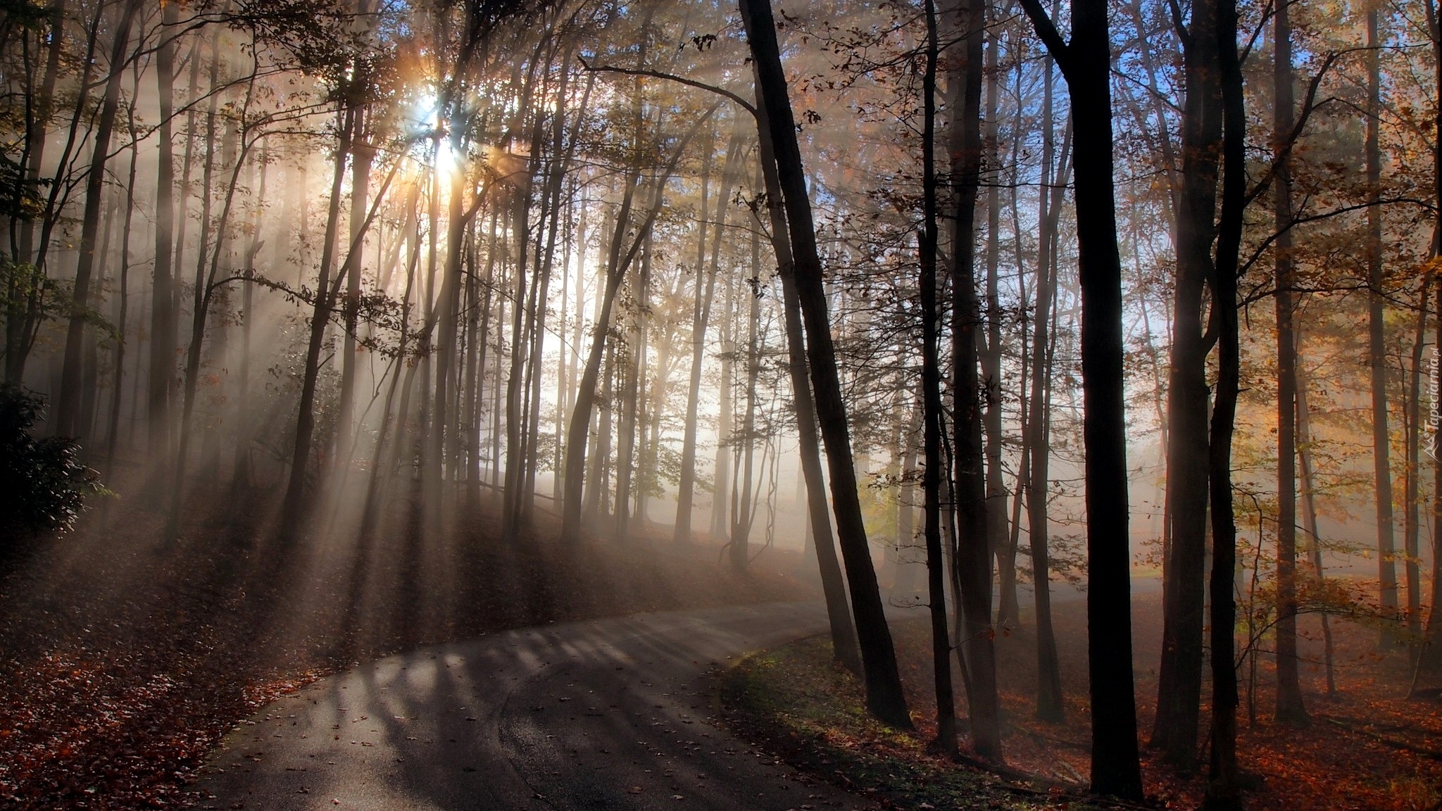 Edytor tapety: Promienie słońca padają na drogę w zamglonym lesie