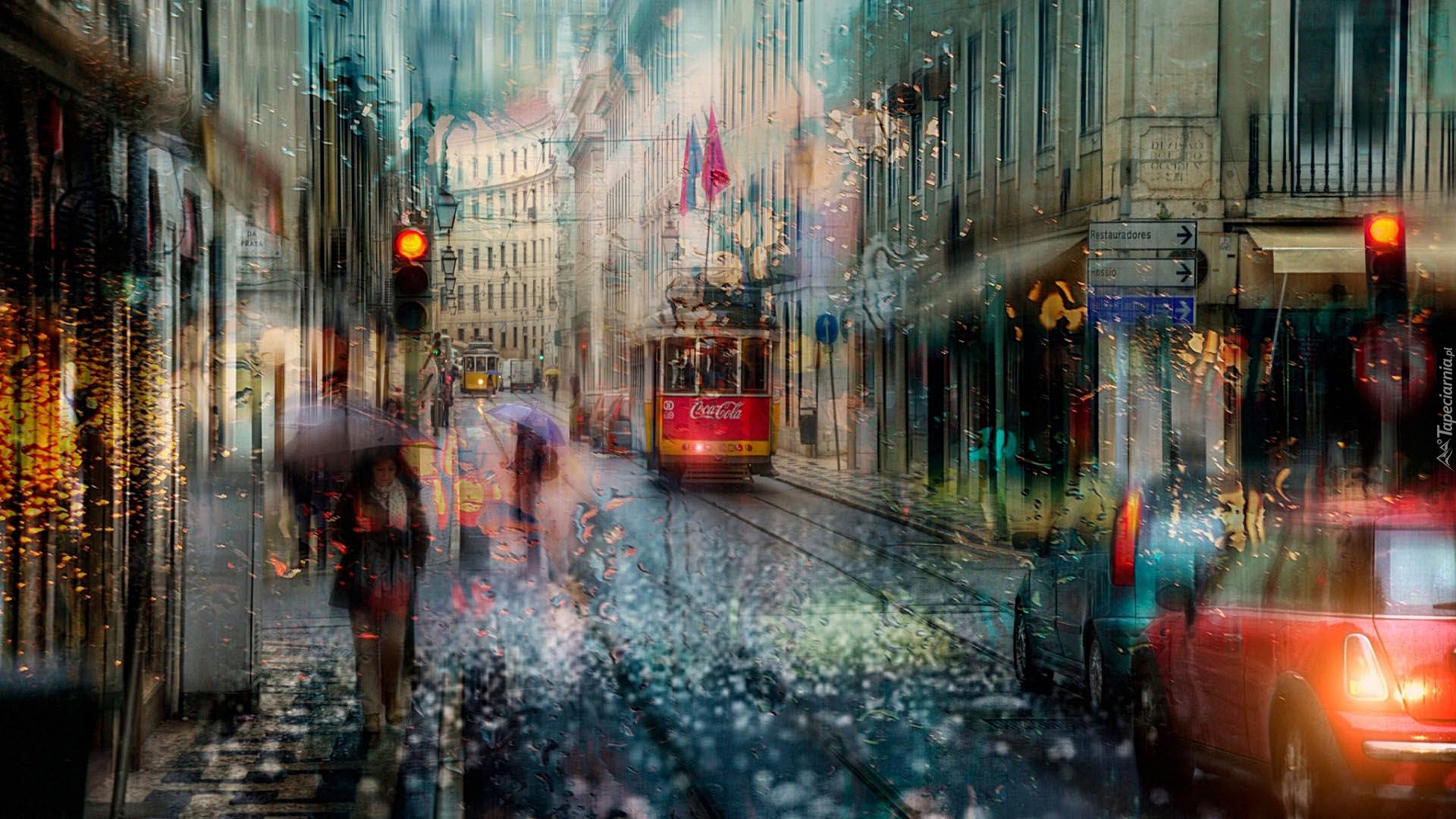 Edytor tapety: Kobieta pod parasolem na deszczowej ulicy