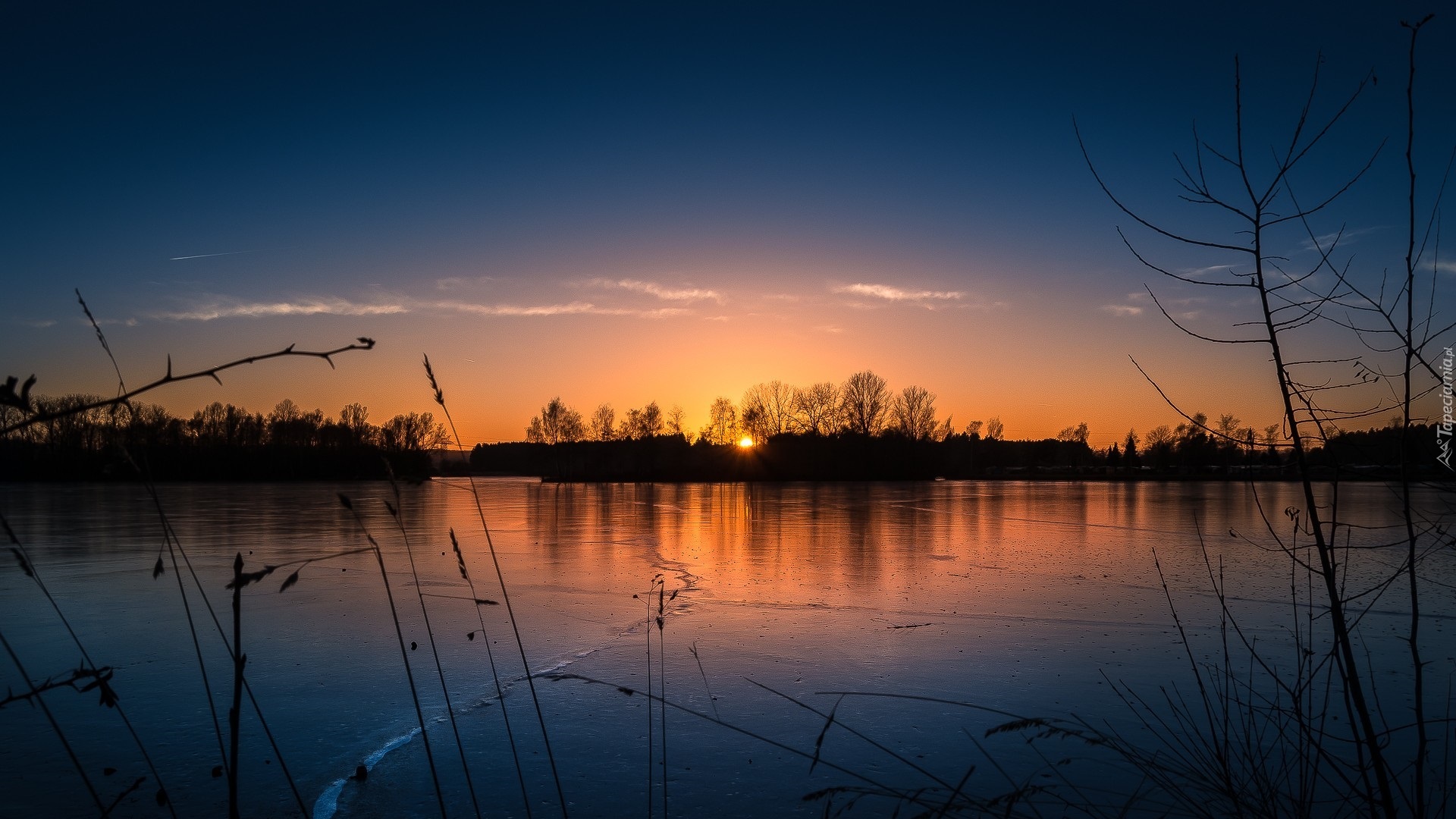Edytor tapety: Zachód słońca nad oblodzoną rzeką