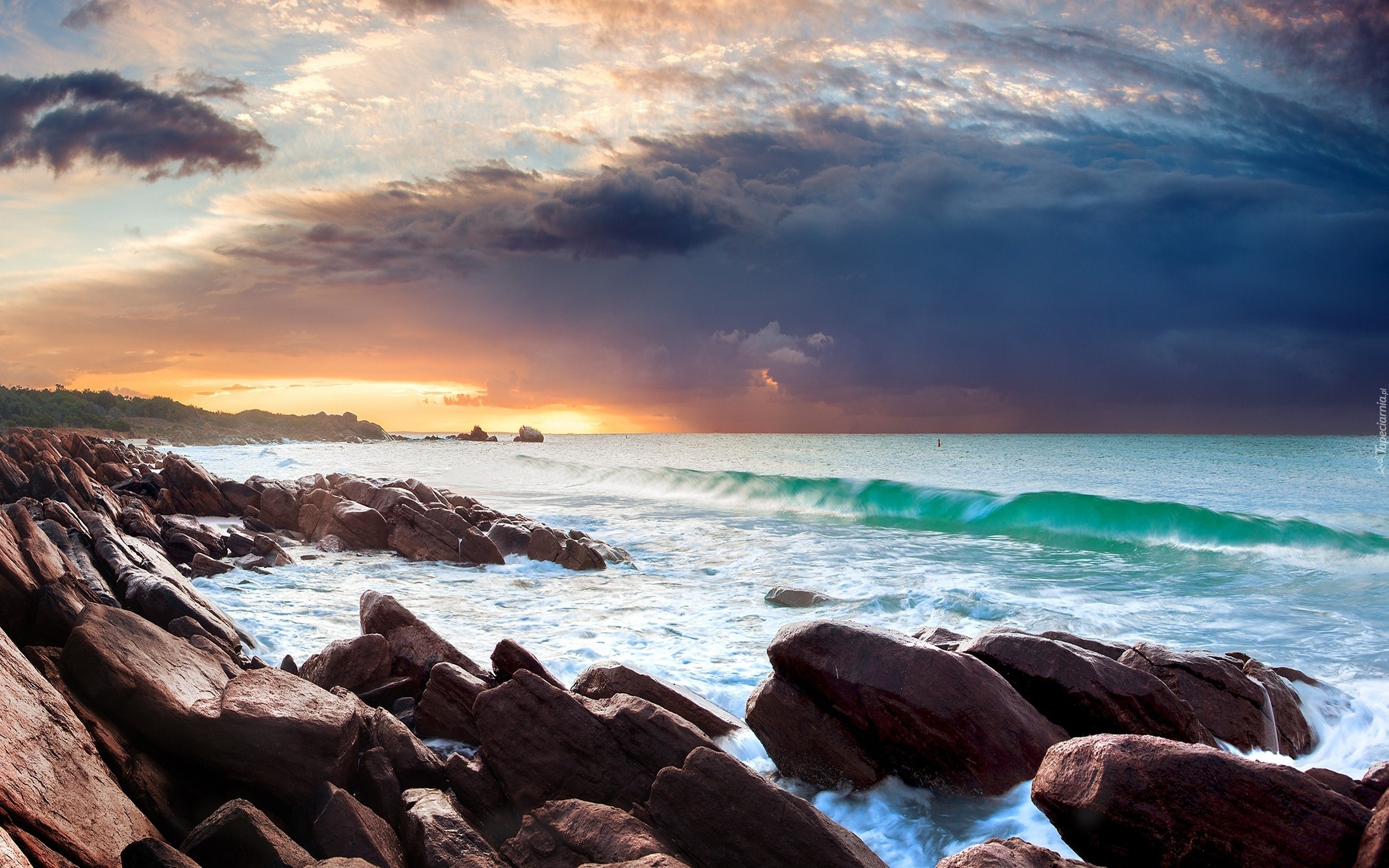 Edytor tapety: Zachód słońca nad skalistym wybrzeżem