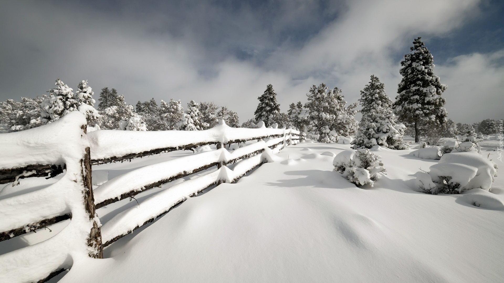 Edytor tapety: Iglaki zasypane śniegiem nieopodal płotu