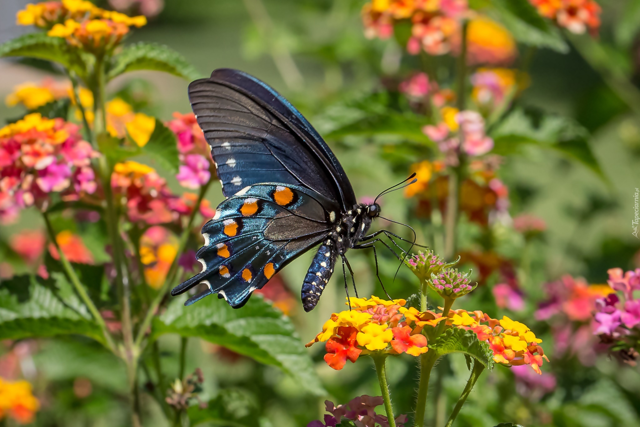Edytor tapety: Czarny paź królowej wśród kolorowych kwiatów