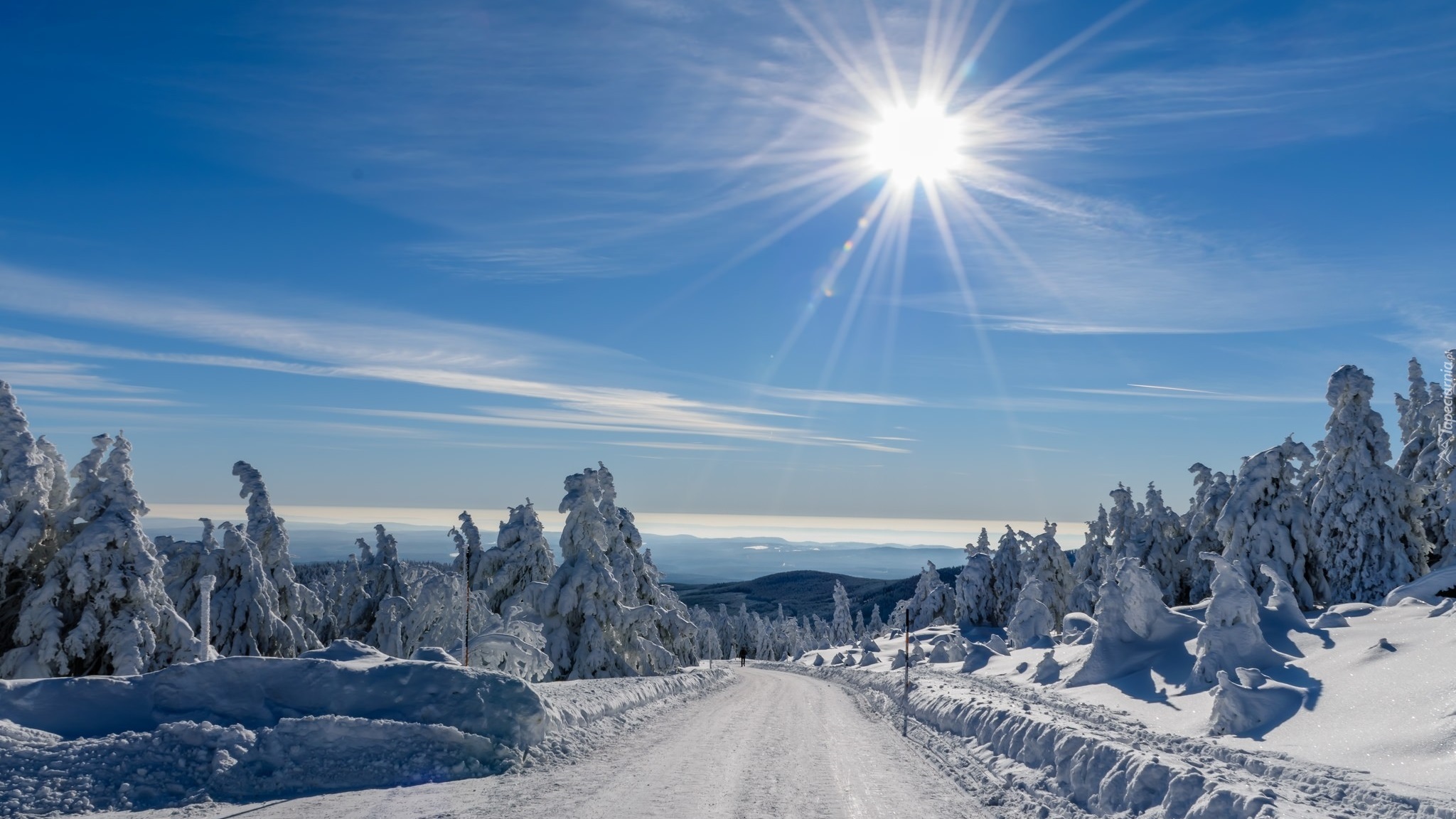 Edytor tapety: Droga między zaśnieżonymi świerkami w promieniach słońca