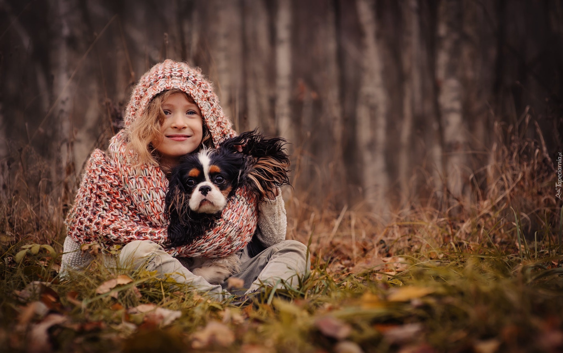 Edytor tapety: Uśmiechnięta dziewczynka obejmuje spaniela na leśnej polanie