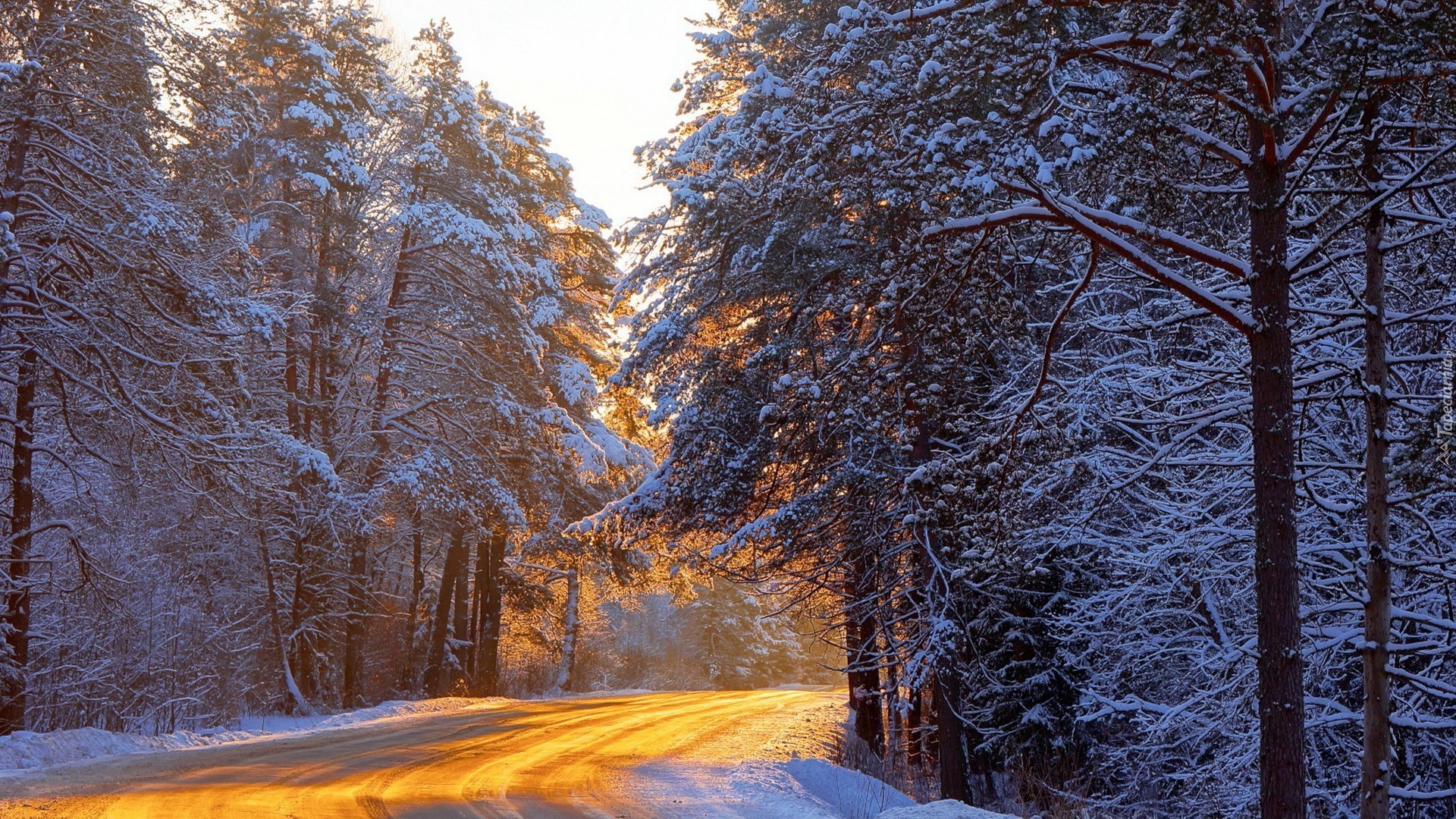 Edytor tapety: Droga oświetlona słońcem w ośnieżonym lesie