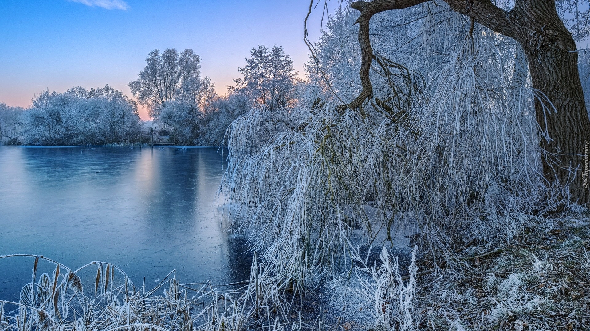Edytor tapety: Oszronione gałęzie drzew nad oblodzonym jeziorem o świcie