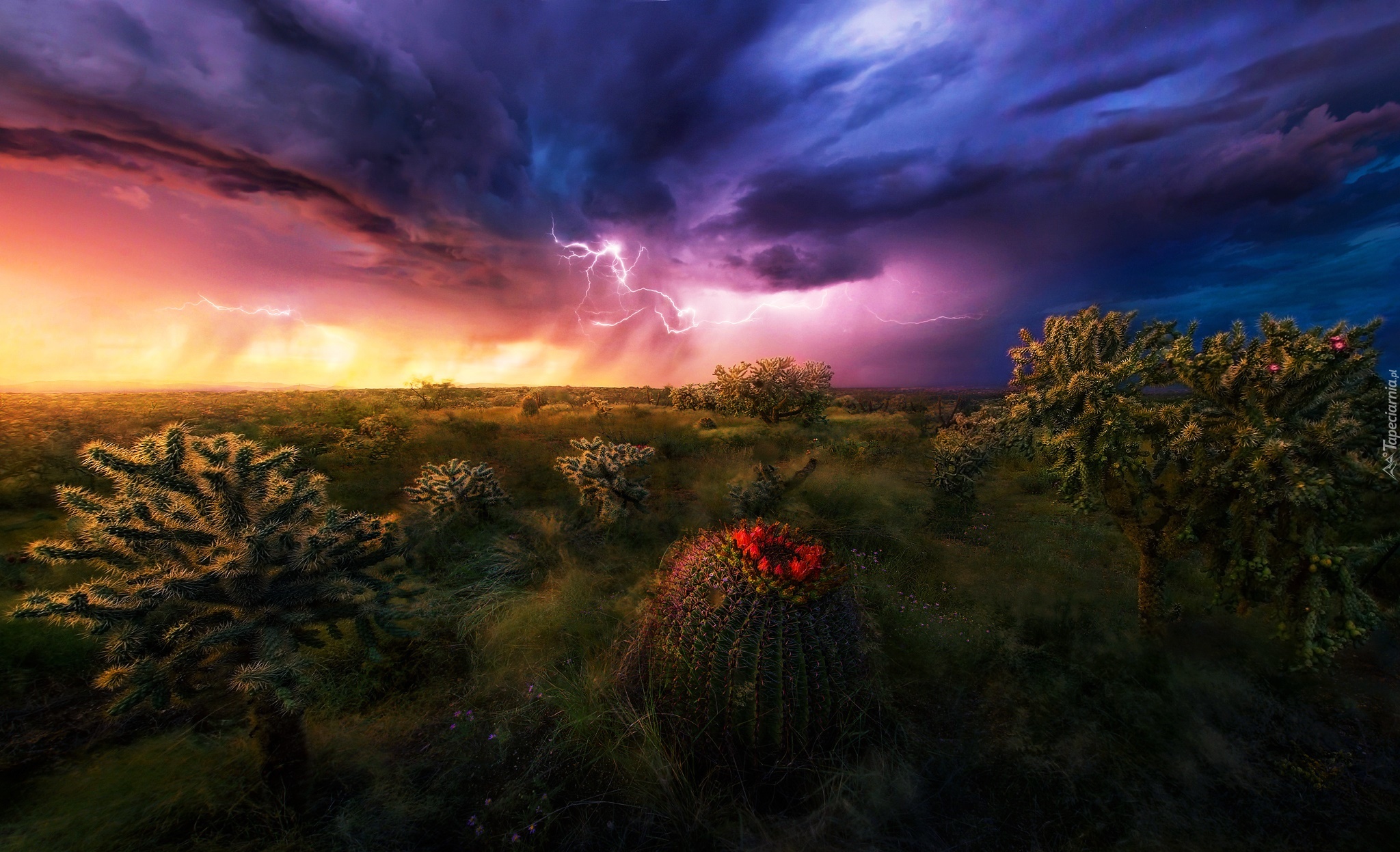 Edytor tapety: Burza nad pustynią porośniętą roślinnością i kaktusami