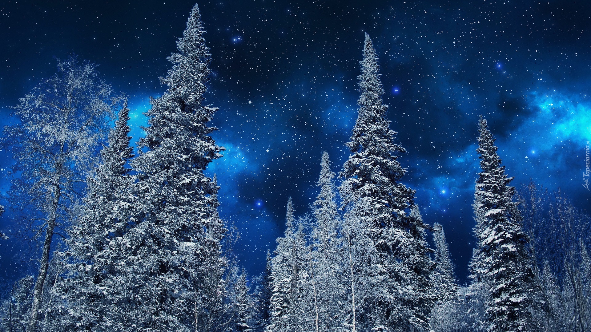 Edytor tapety: Ośnieżone świerki siegają nieba