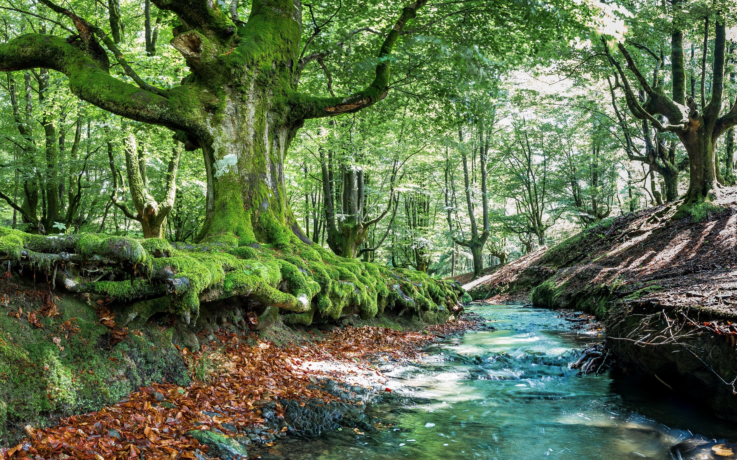 Edytor tapety: Rzeka płynącą przez omszaly las w słońcu