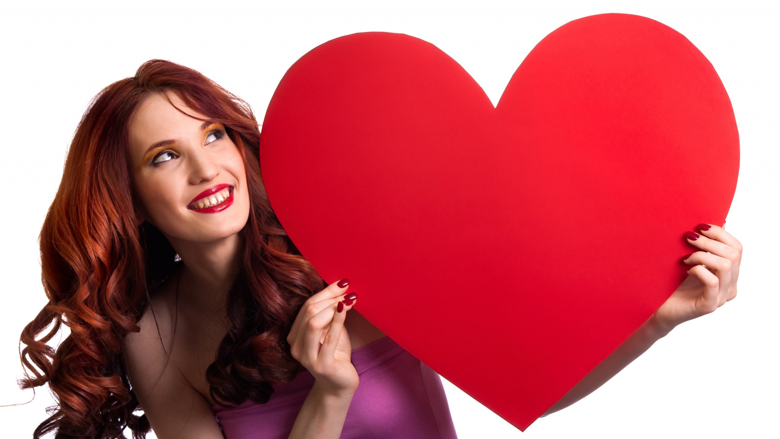 Edytor tapety: Uśmiechnięta rudowłosa kobieta z ogromnym walentynkowym sercem