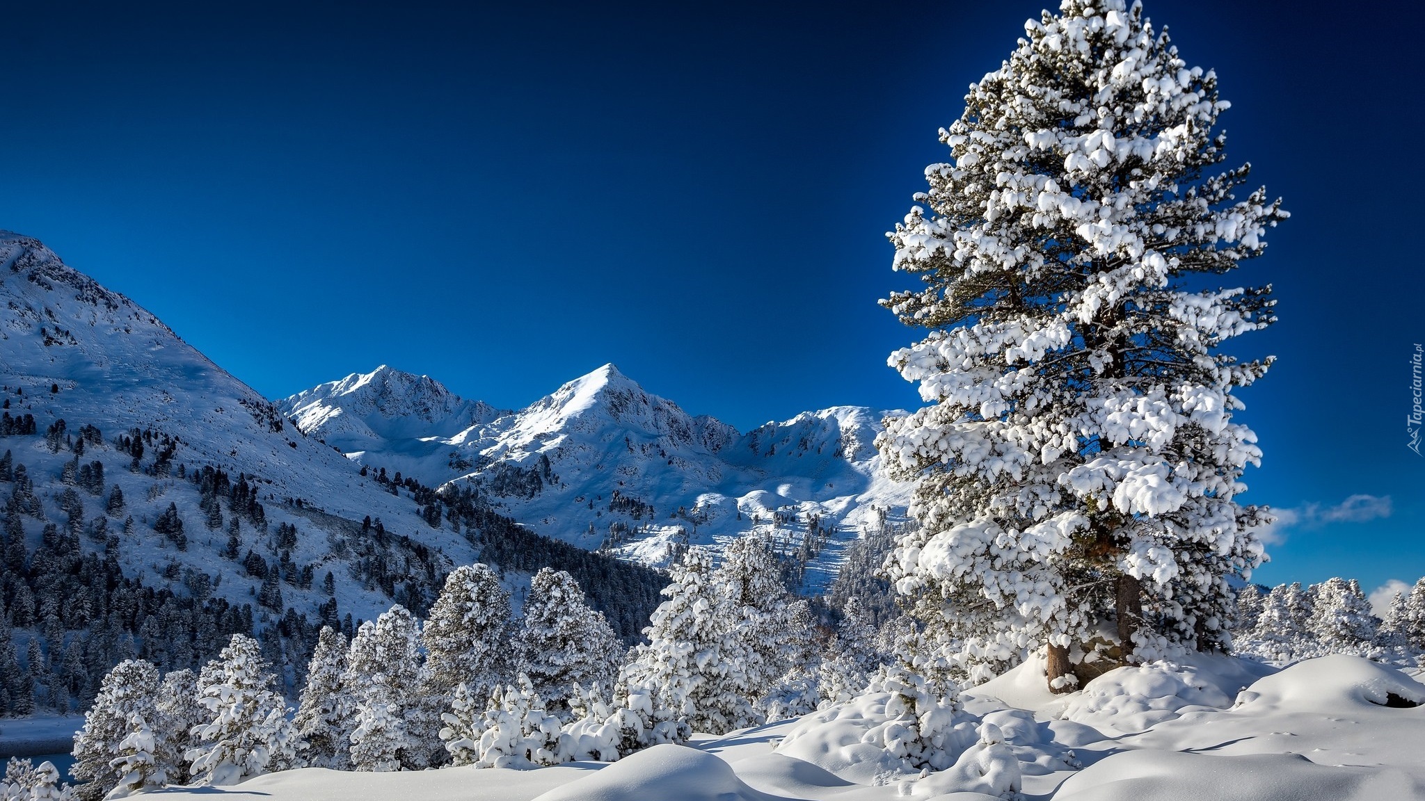Edytor tapety: Ośnieżone świerki w zimowych górach