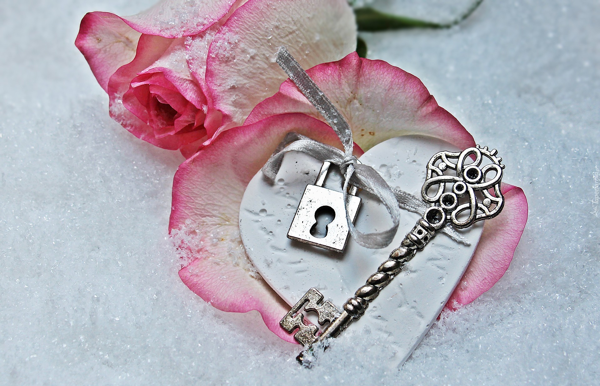 Edytor tapety: Walentynkowa kompozycja z różą, sercem i kluczem