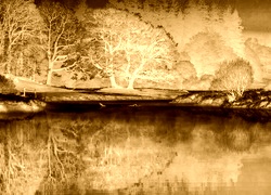 Edytor tapety: Oszronione drzewa odbijają się w jeziorze w porannym słońcu