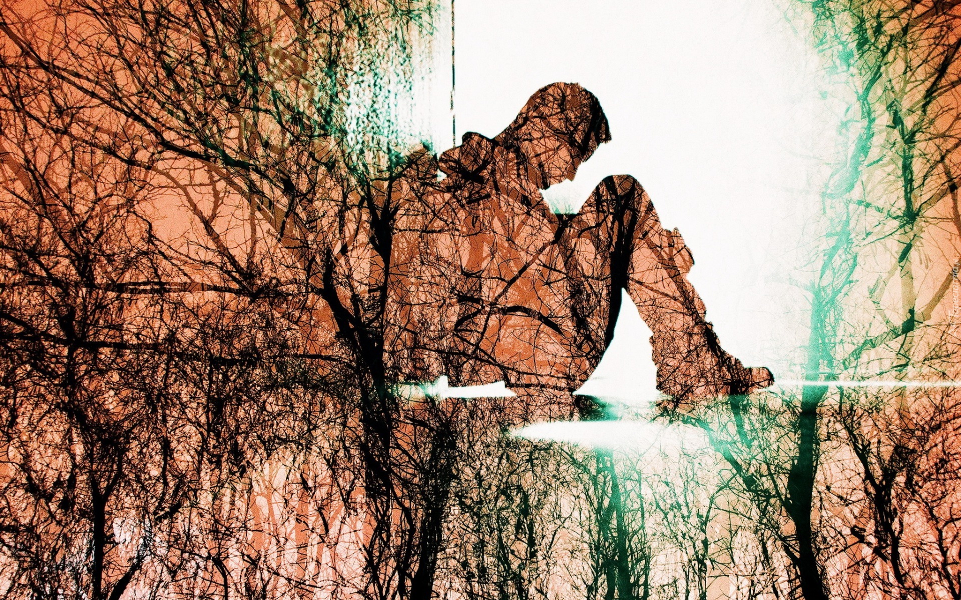 Edytor tapety: Grafika paintography z siedzącym mężczyzną i drzewami