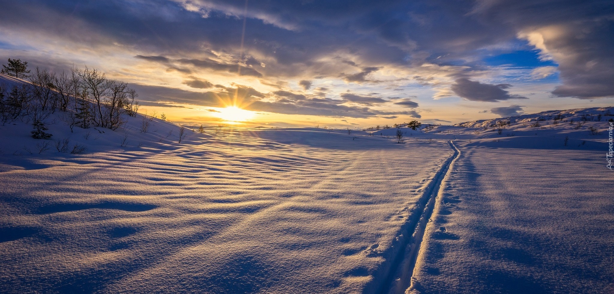 Edytor tapety: Śnieg zasypał pola i wzgórza