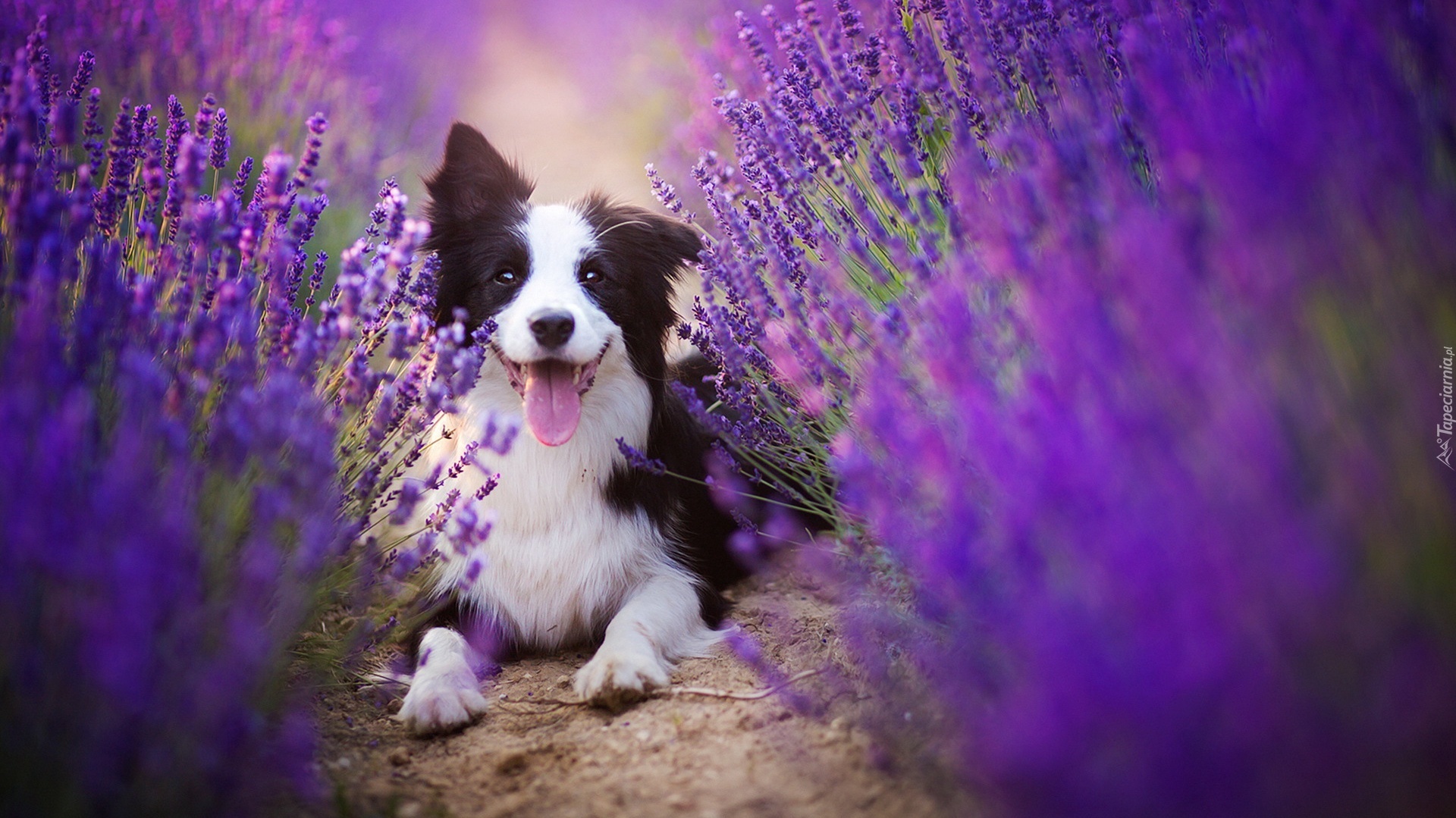 Edytor tapety: Border collie pośród kwiatów lawendy