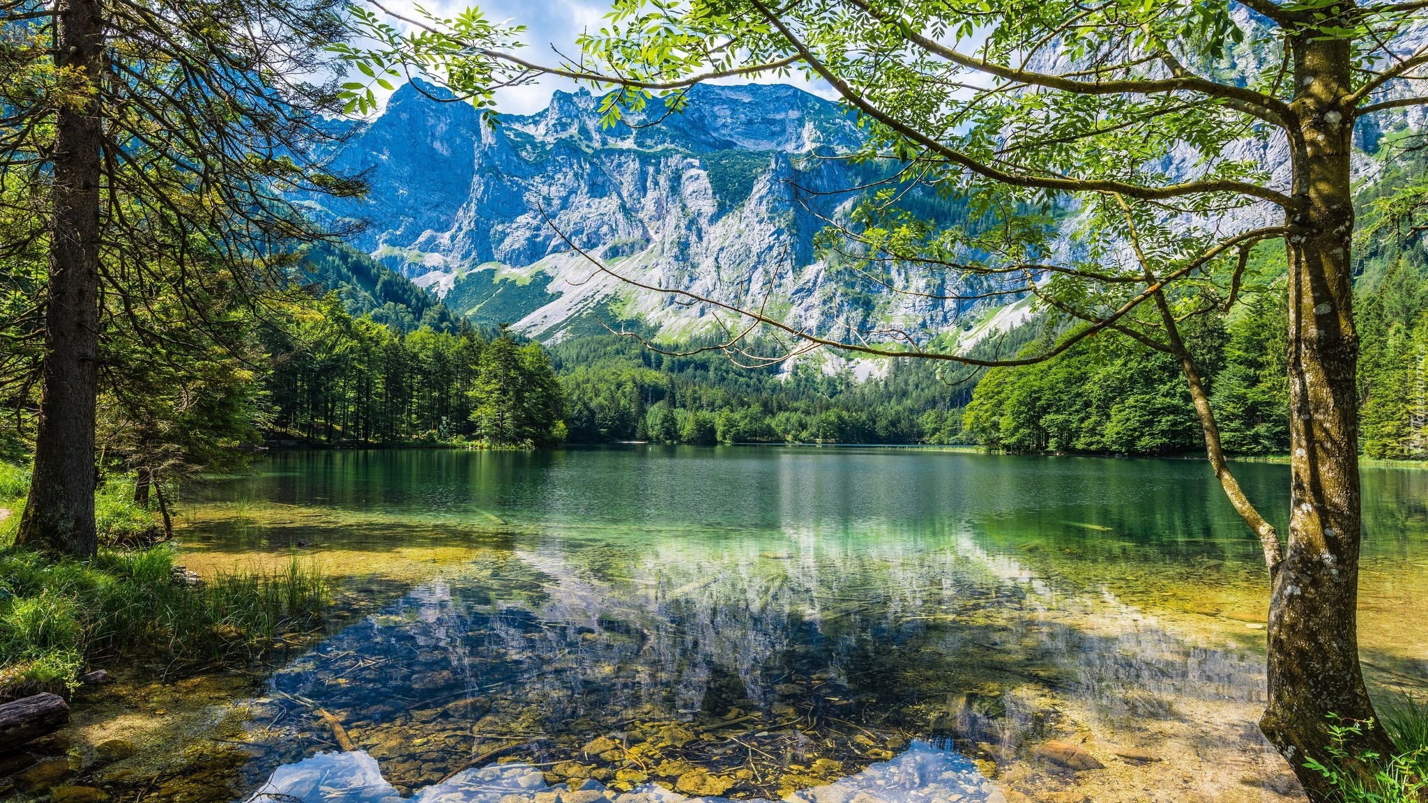 Edytor tapety: Górskie jezioro otoczone drzewami