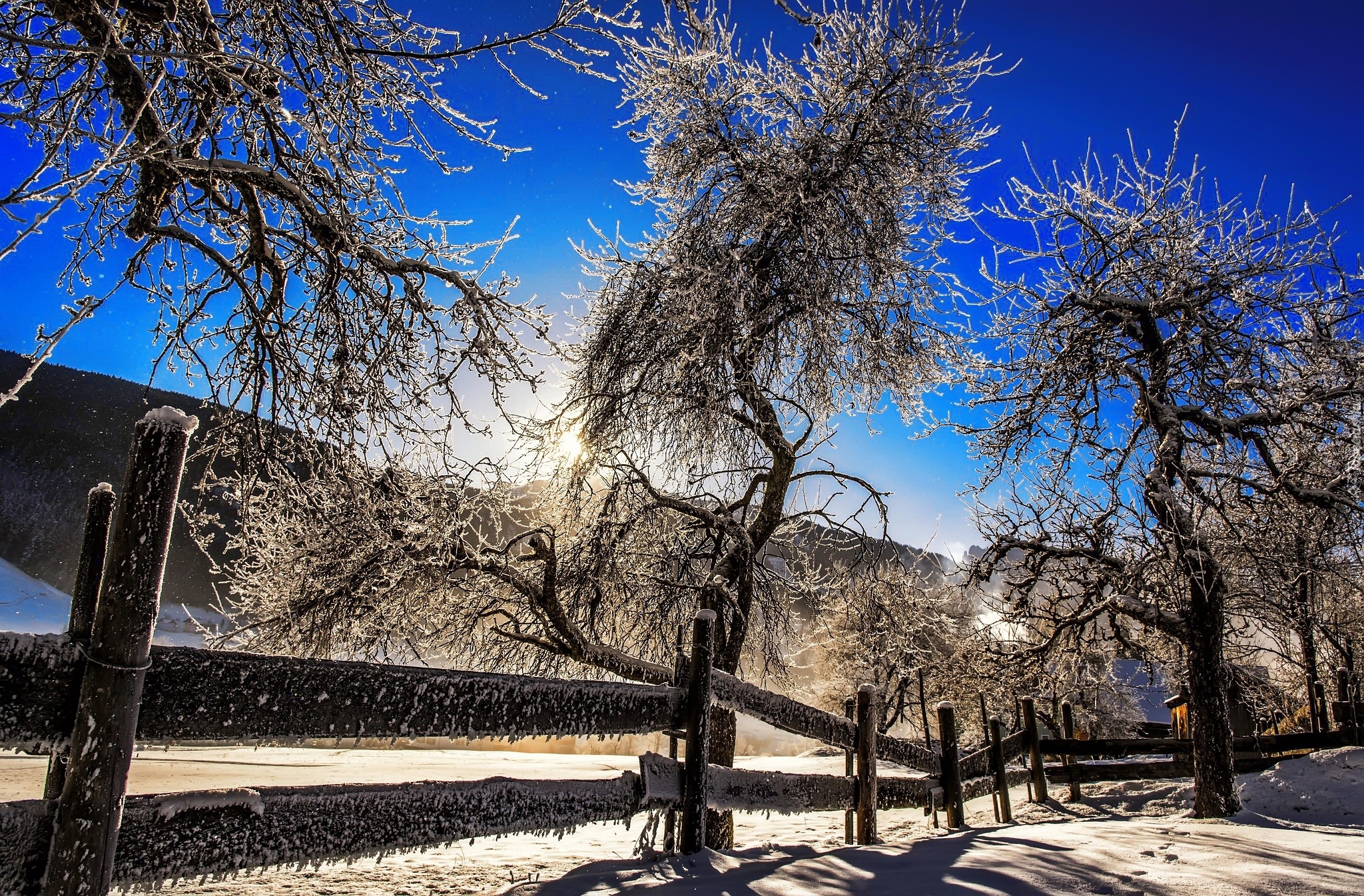 Edytor tapety: Oszronione drzewa przy drewnianym ogrodzeniu