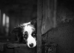 Edytor tapety: Border collie wygląda zza drzwi szopy